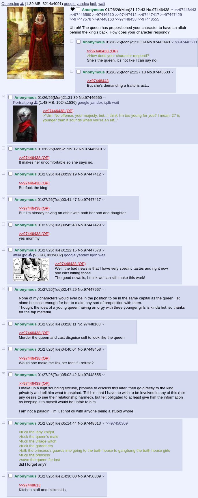 >>97482916What if the king doesn't believe you and demands your execution for insulting the queen's honor?