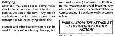 Basically you just declare parry at the start of the turn with some item you are carrying and the melee attack hits that item and deals damage to it and soaks that damage for you based on how many hitpoints the gm decides the object has.