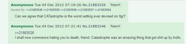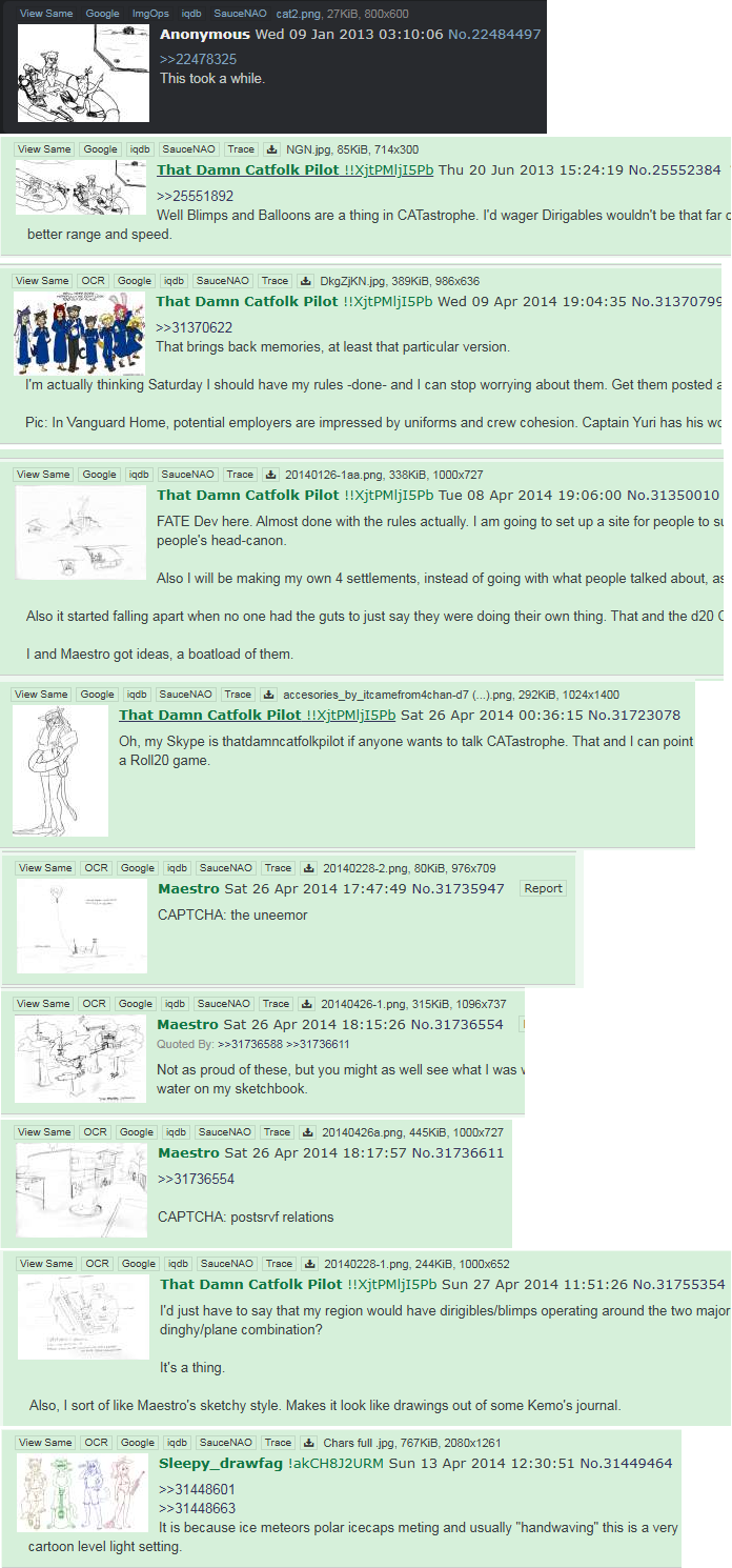 Is anyone searching the archives for CATastrophe?Might help the scope of any attempted reboot.And if not, it's just fun to read the ancient bickering.https://archive.4plebs.org/tg/thread/21881791/#21883526These old posts and threads are relics of an era gone by, much like the flooded undersea world of CATastrophe.