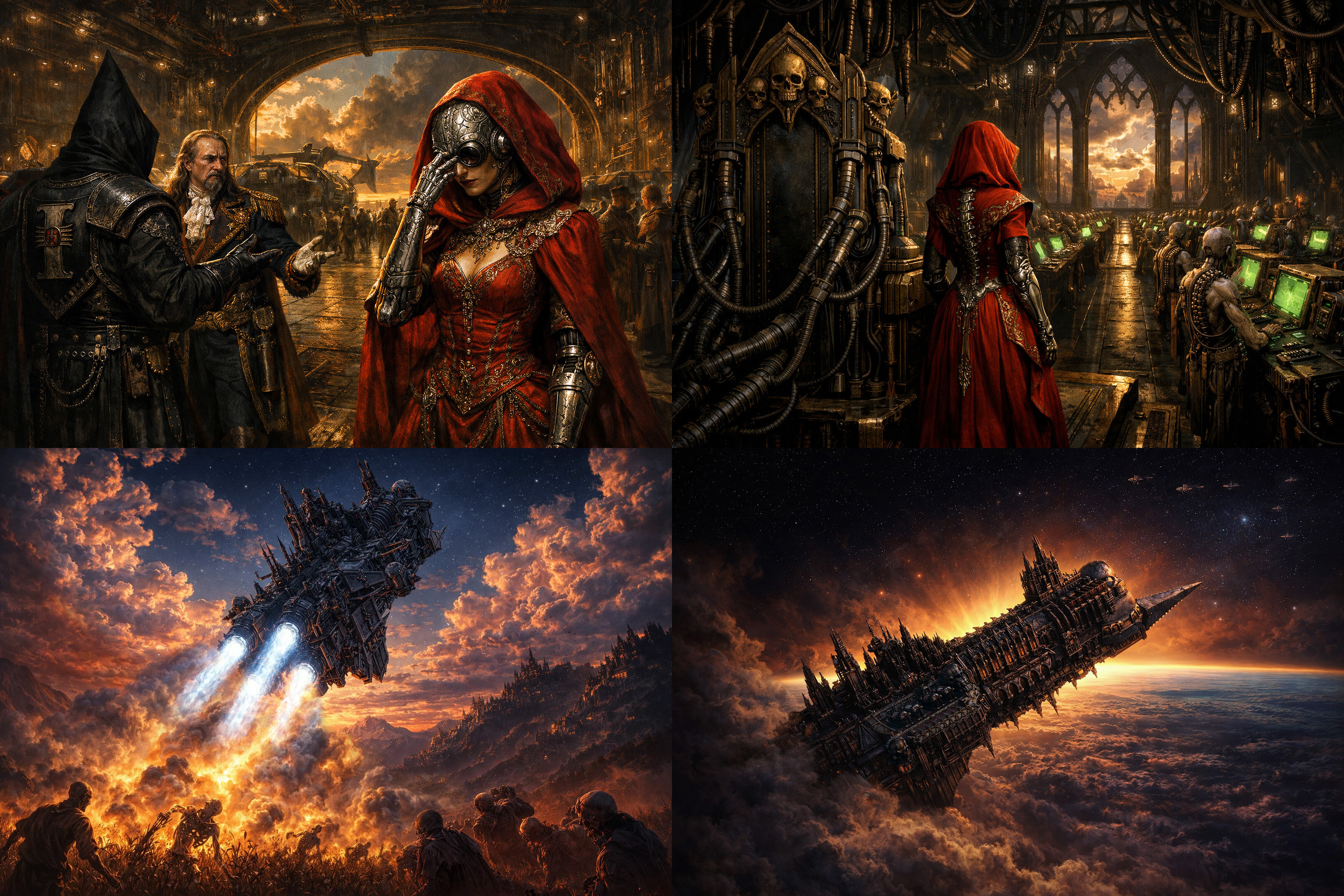 At long last, the tale of the Techpriestess continues from https://archive.4plebs.org/tg/thread/97227237/#q97237869.>As dusk fell upon the world of Sarnath, the time had come to rejoin the fleet in orbit, and the Priestess invited her noble guests to join her on the bridge of the cruiser. Yet at the mere suggestion that any might remain aboard for the ascent, Inquisitor Corsini flew into a rage of recriminations against risking the august personages of Imperial nobility with such an unorthodox maneuver.>That this was some manner of ruse, Salafié had no doubt: Though she had come within an inch of taking the Inquisitor's life not an hour earlier, the man showed no fear of her, yet seemed almost manic in his urgency that none remain aboard. But what could be said? The nobles grew uneasy at the Inquisitor's ranting, so Salafié grudgingly parted with her guests at the hangar deck, leaving them to make their own way back to the fleet as she decamped to the bridge, where her servitors were already making preparations for liftoff.>In the fields far below, a crowd of peasants gazed up in wonder as the colossal ship hanging over their valley seemed to pivot in place, pitching upwards towards the sky. Then, it was as though a second sun rose above them as the main plasma drives of the 'Pitiless Blade' ignited for an orbital insertion burn. Men who knew not what they saw were flash-carbonized amidst the blinding light, their charcoal flesh crumbling in the maelstrom of the cruiser's exhaust plume as it rose gracefully into the sky. >Upon the bridge, the atrocity went unnoticed as the cruiser pierced the upper atmosphere, emerging into the cold light of space. In high-orbit, the fleet glimmered like jewels in the blackness. One of the smaller vessels, a frigate, seemed to drop out of formation with the others, but the Priestess paid it no heed as she deftly guided her cruiser into an orbital trajectory, blissfully unaware of the doom that drew closer with each moment.