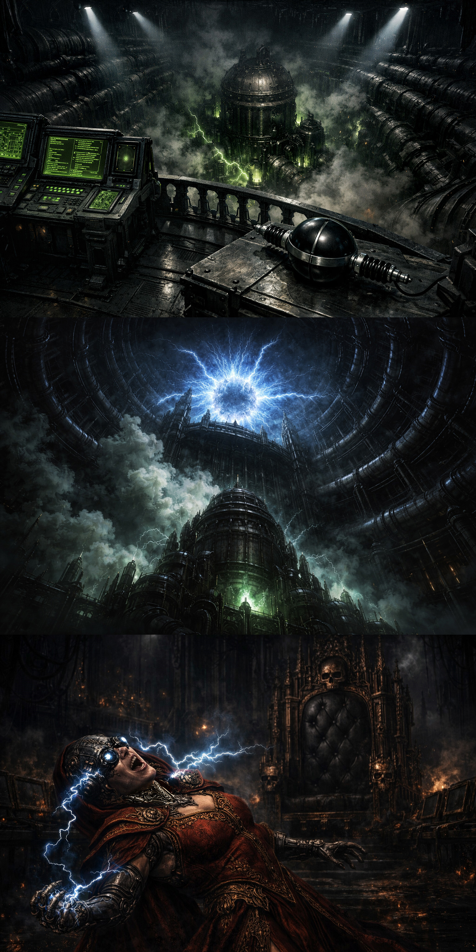 >>97454150>A hundred decks below, in the depths of the Enginarium, an unassuming black sphere lay unnoticed where Inquisitor Corsini had placed it hours earlier, nestled alongside the cogitator banks that controlled the ship's power distribution grid. It was, of course, the magnetic pulse bomb gifted to him by Salafié's enemies among the Adeptus Mechanicus, themselves no less eager than Corsini to finally do away with the heretic Priestess. There it sat, as it had sat in the vaults of Mars for fifteen millennia, a remnant of a time when thousands like it had been deployed against the thinking machines at the dawn of the Age of Strife. >And now, at long last, it was called to fulfill its ancient purpose against the heresy of silica animus! As the subtle mechanisms within it registered the shift in gravitation as the cruiser reached the pre-set altitude, the device triggered, its field coils whining to a crescendo from the charge building within it. In the span of a millisecond, the Enginarium was bathed in a baleful blue-white glare as an expanding sphere of arcing electromagnetic energy erupted from the device, washing over the delicate cogitator banks and inducing a cascading power surge that coursed through every system on the ship.>On the bridge, Salafié cried out sudden in agony as feedback from the noospheric relays overloaded her cranial circuitry, convulsing in a hideous paralytic spasm for what seemed like an eternity as consoles exploded into electric flames and the air was filled with the acrid scent of burnt wiring. At last, the failsafes triggered and forced the ship's machine-spirit into shutdown, and the Priestess collapsed into unconsciousness as the primary power grid went offline, casting the bridge into darkness.