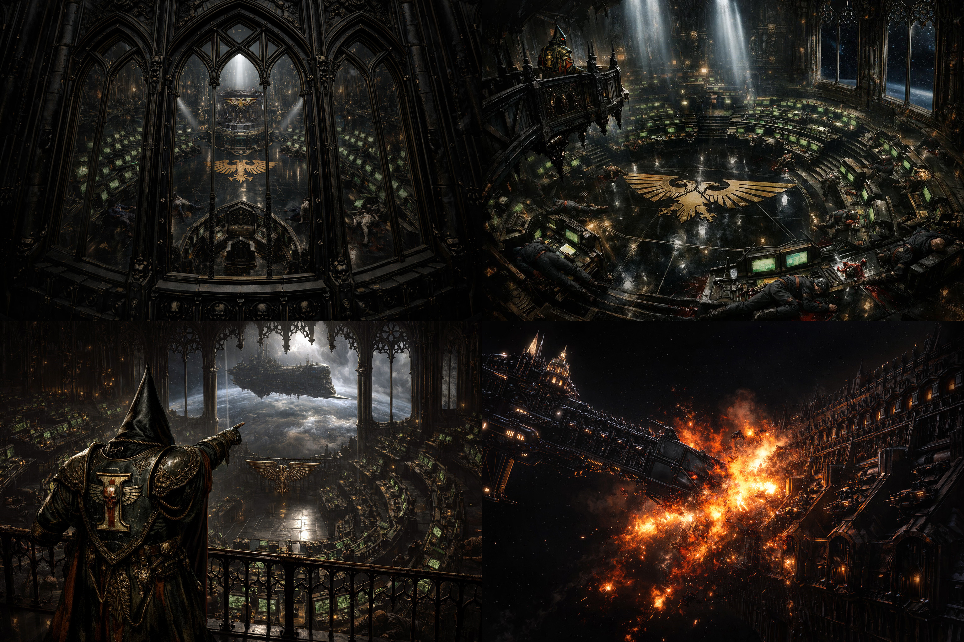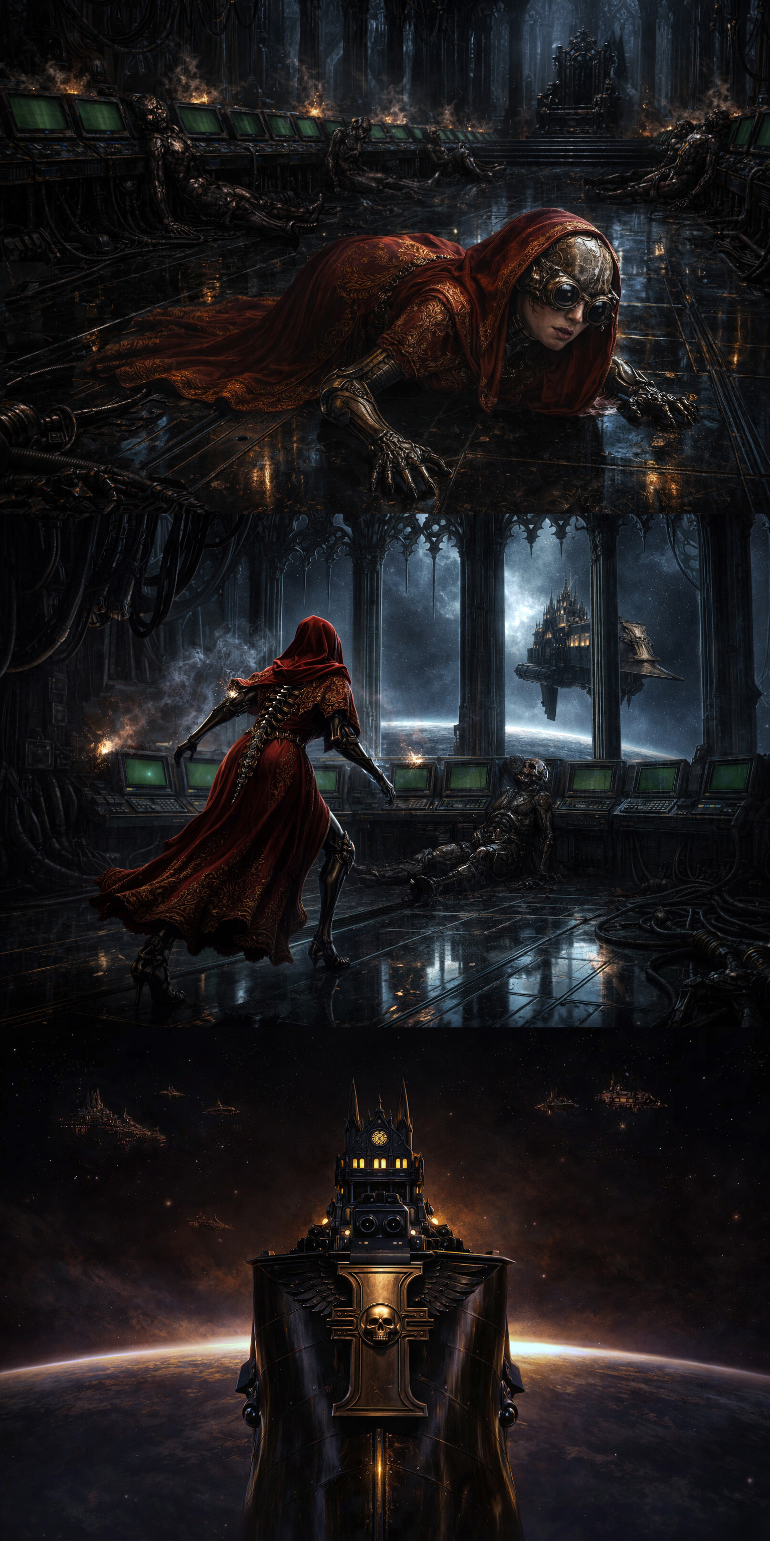 >>97454189>Salafié awoke to the sound of a blaring siren, the organic portion of her mind returning to consciousness while her bionics remained offline. What was happening? Where was she? Who was she? She could not see, could not feel her limbs. The siren sounded again, and she choked on air thick with metallic smoke as she writhed in horrified confusion upon the cold metal deck plating. >Suddenly, the cogitator array at the base of her skull rebooted and she was herself once more as it overwrote the emotional impulses of her vestigial brain. With a mechanical swiftness, the Priestess sprang to her feet, recognizing the sound of the emergency proximity alarm. She cycled through the inputs on her ocular implants, until an image resolved and she saw her bridge in ruins, with burned-out consoles and servitors slumped limply upon the deck like marionettes with their strings cut. And there, looming beyond the towering windows, a frigate in the black and gold livery of the Inquisition bore down upon her cruiser.>In an instant, the Priestess understood what had transpired, cursing Inquisitor Corsini for his duplicity and herself for falling into his trap. Ah well, it would not be the first time she had spilled blood upon this ship, and an Inquisitorial boarding party would make good sport indeed. But what was this? The frigate did not slow its approach for docking, but only accelerated in its approach! Horrified, it dawned upon Salafié that the frigate was on course to ram, and she franticly darted from console to console across the bridge, frantically seeking to restart the engines or trigger the maneuvering thrusters or bring the cruiser's mighty guns to bear. But it availed her not, as the reactors deep below overloaded and went into hard shutdown one after another, leaving the ship stricken and helpless before the onrushing threat.