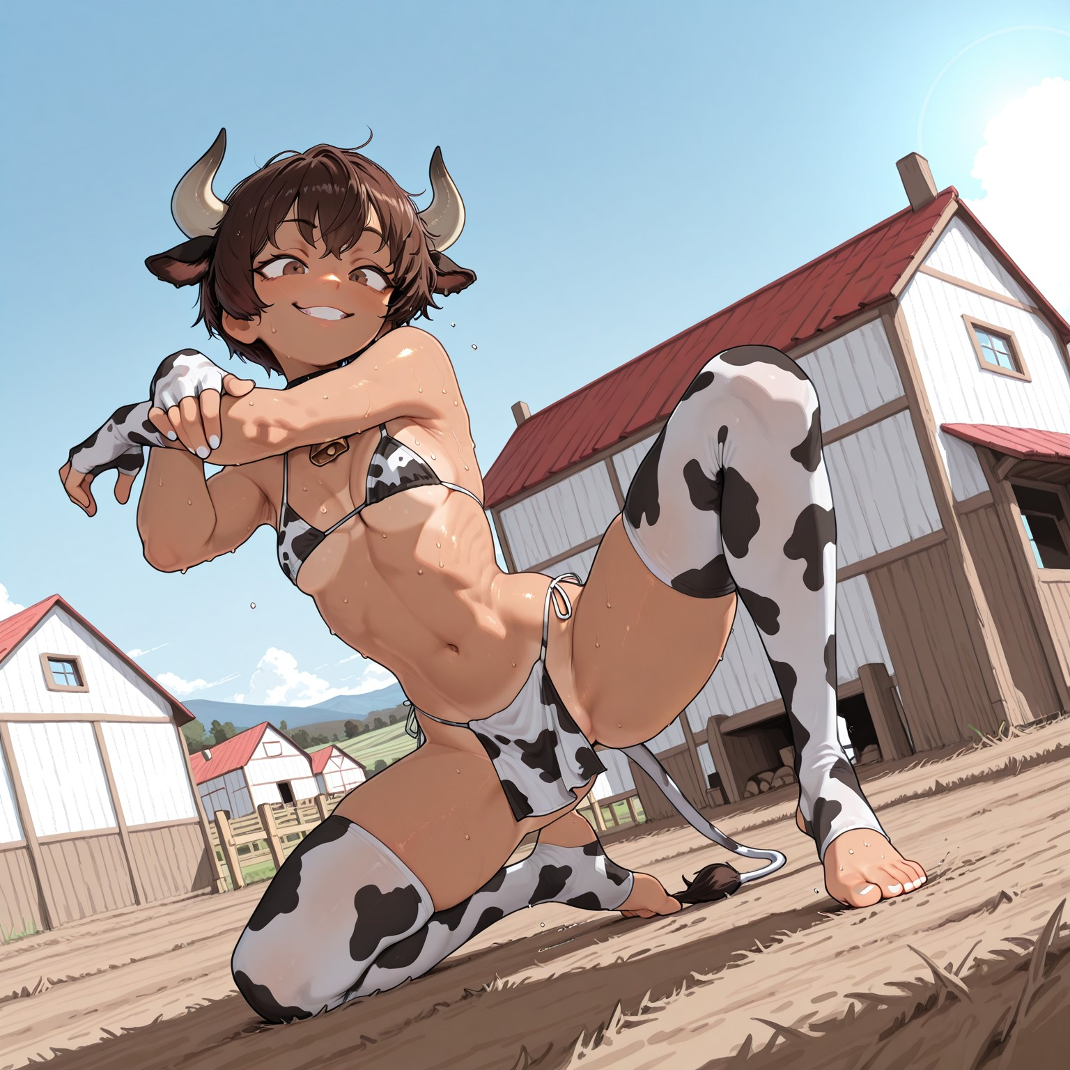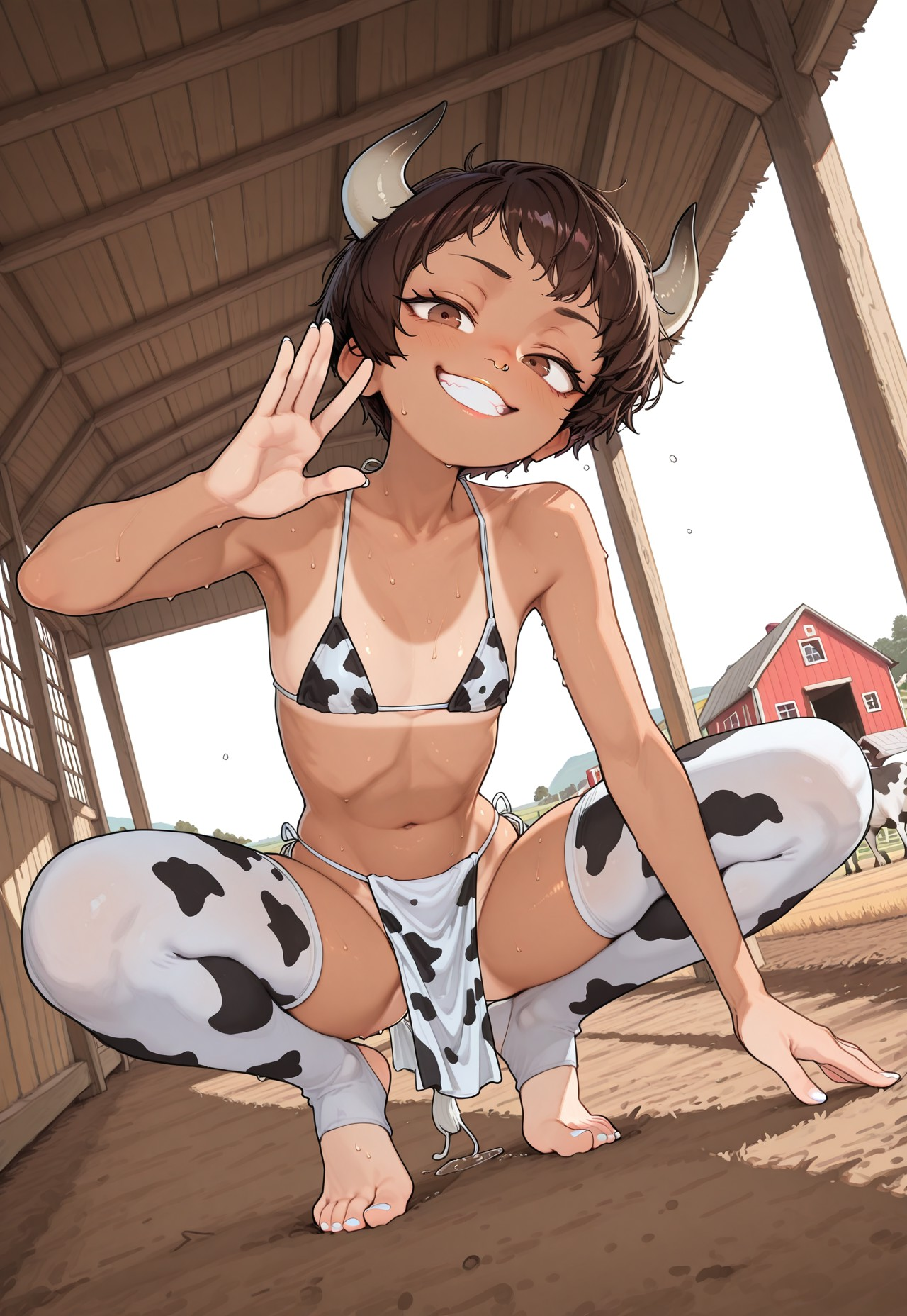 >>97455433She squats low in the yard like she meant to do something else and got pleasantly distracted halfway through. Water beads slide off her shoulders and drip from her nose ring, leaving little polka dots on the ground she immediately notices and proudly claims as her own. The tail has opinions and keeps swishing them into the moment, tapping ankles and wagging whenever someone laughs. Her horns catch the sun just enough to frame that wide, uncontained grin, the kind that shows up before the idea does. She shifts her weight, bare feet pressing happily into the dirt, already buzzing with the sense that today will involve running, splashing, and at least one thing knocked over by accident. Whatever happens next, she is clearly ready for it, mostly because she thinks it will be fun.