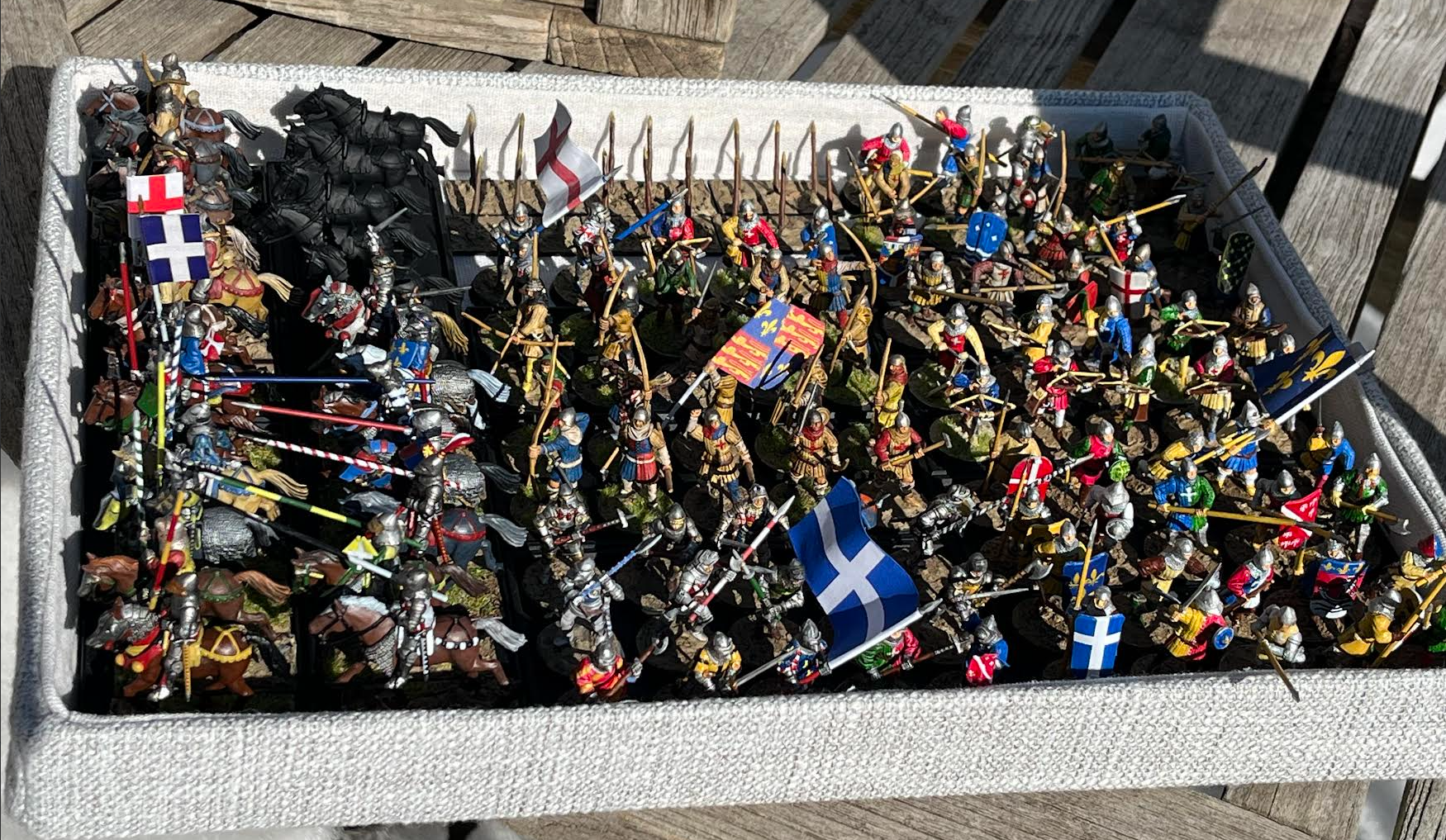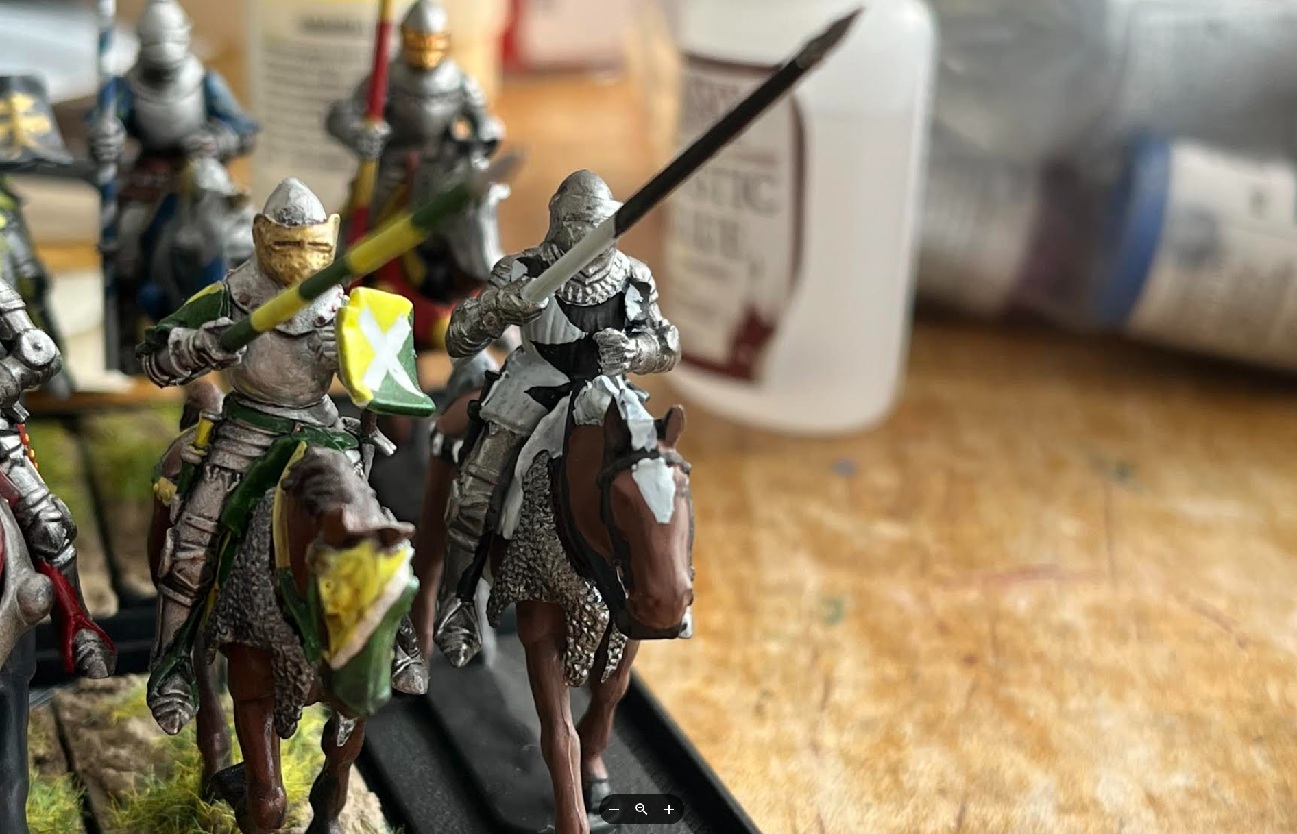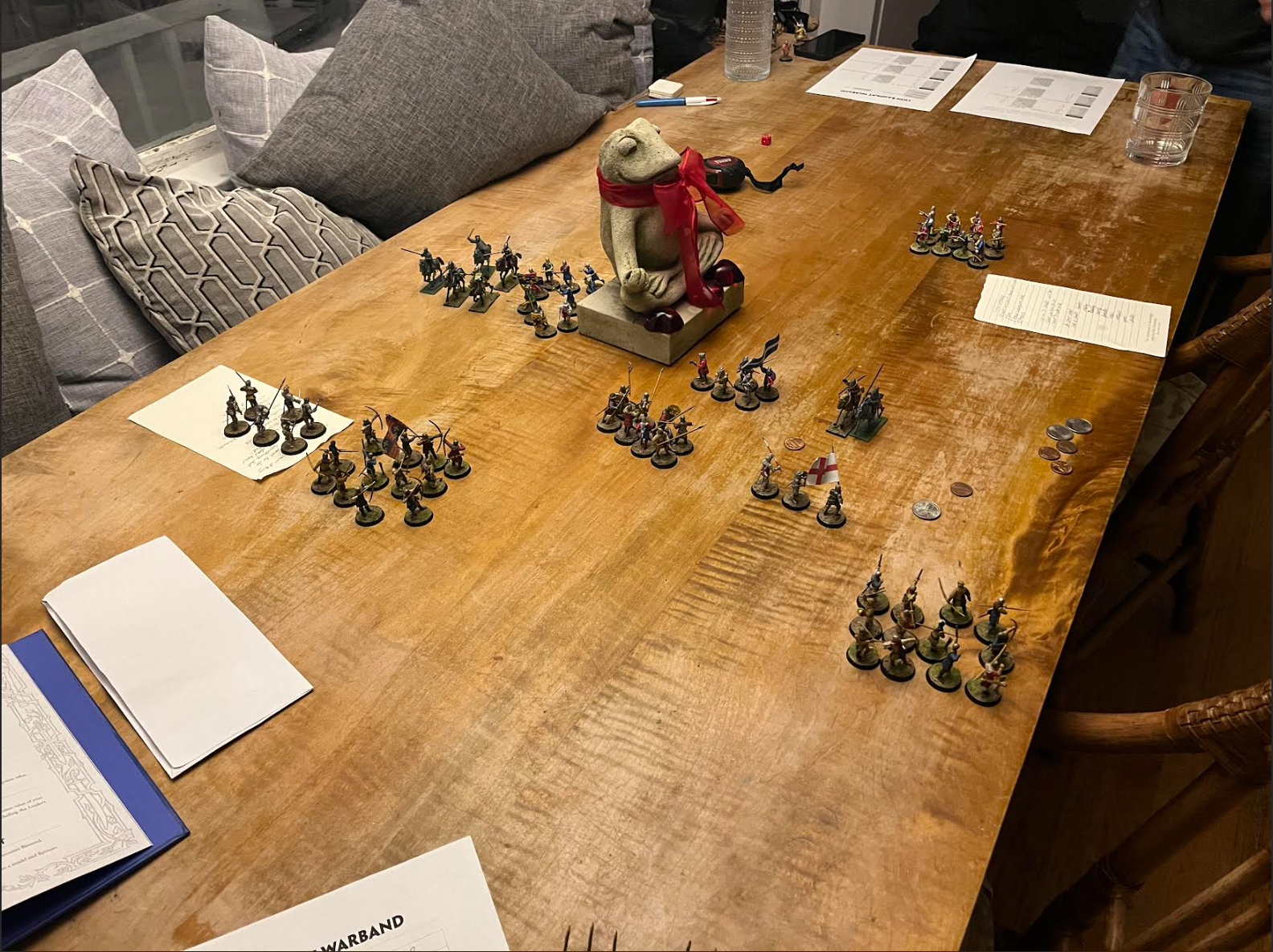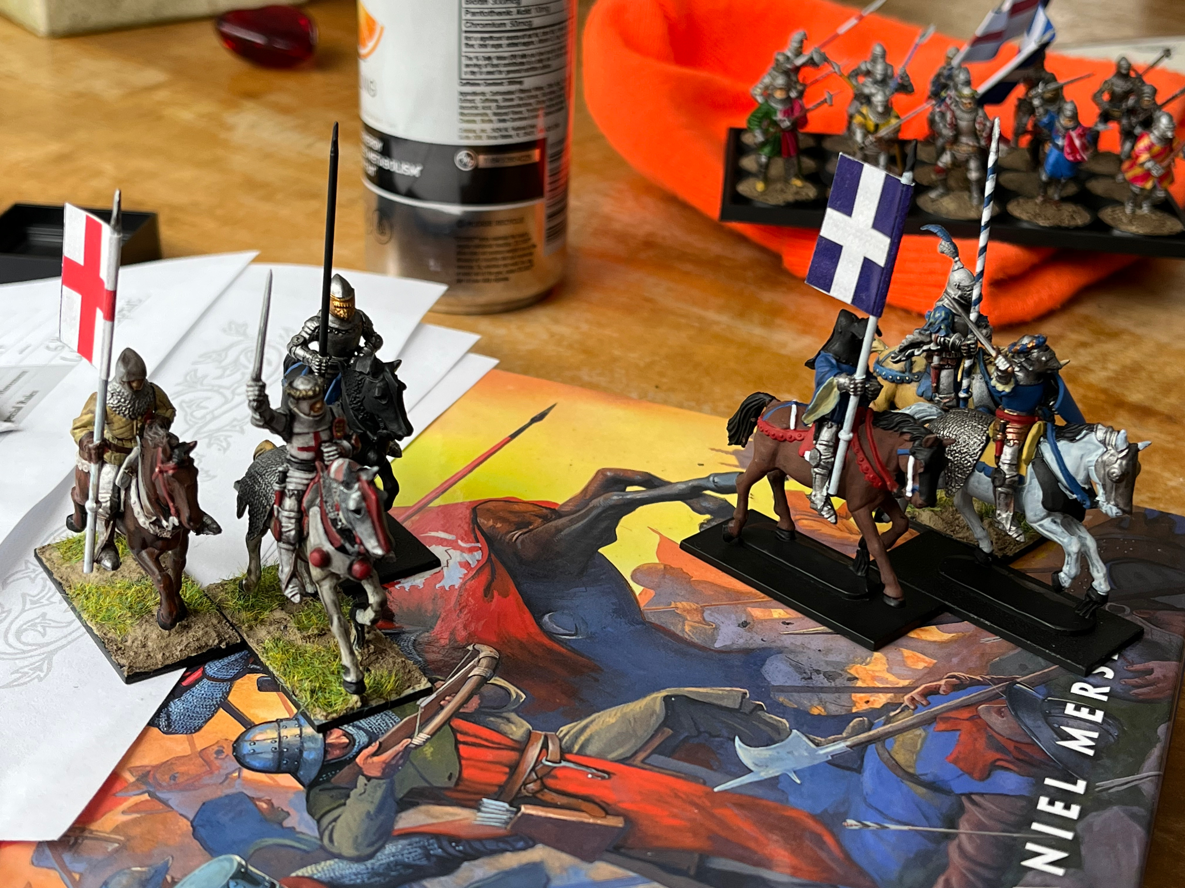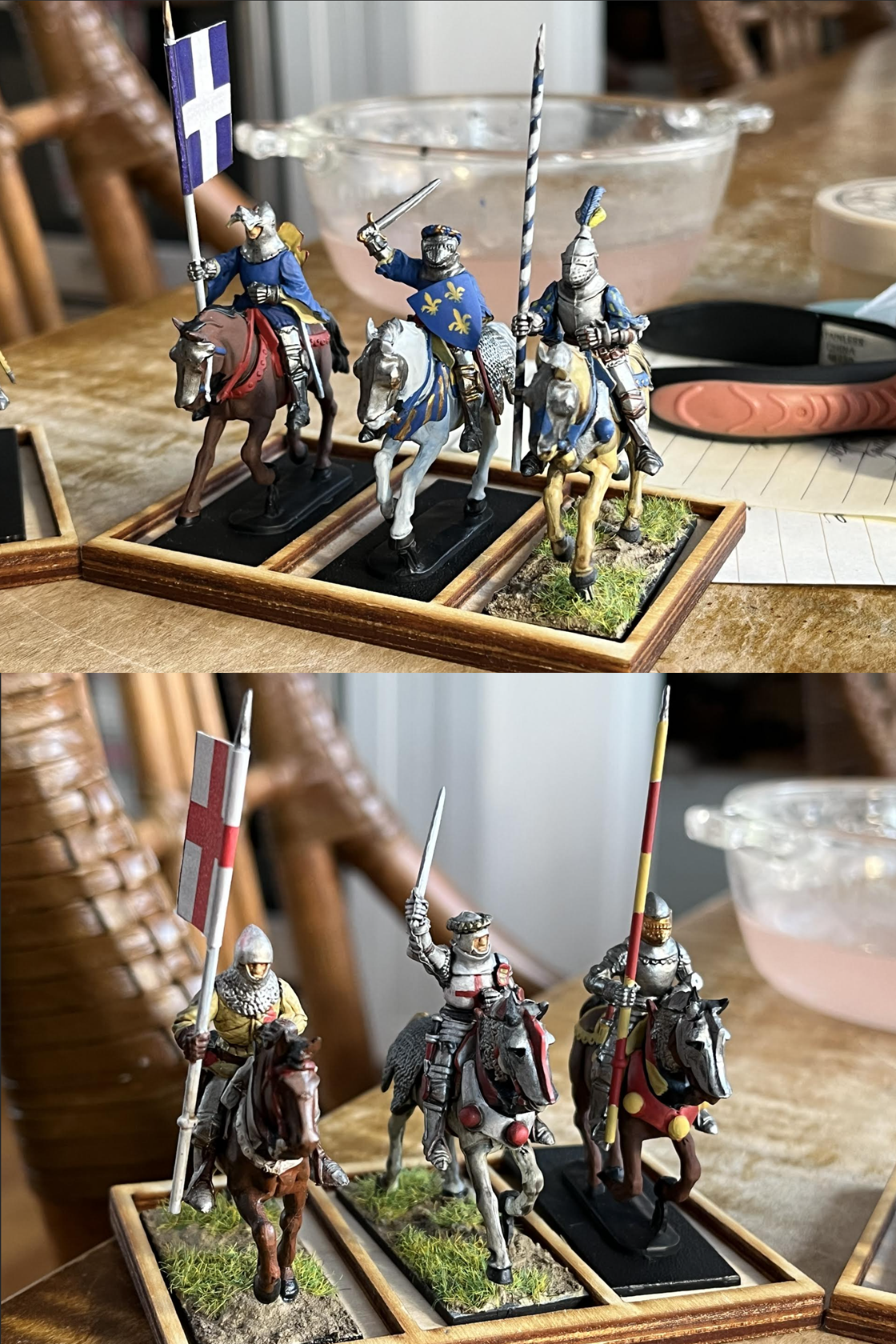Like I said before, I played Lion rampent since enough of my models were done to play a game of that. But I am also interested in Hail Ceaser. Here are the two prospective command squads for the English and French. The perry mounted knight set I used included Orle, so I used that to designate the commanders, though I painted the french commander's Orle to be more of a torse, since Orles I believe to be a more distinctly english thing. Anyways, the contrasting gold and blue looks really nice imo.Was also thinking of trying out oathmark rules since I have a lot of 5 by x movement trays and I like the idea of general warhammer fantasy-esque rules. (I know there is also the medieval expansion for warhammer ancients, but one step at a time. Damn I wish there was a good battle report out there for it).