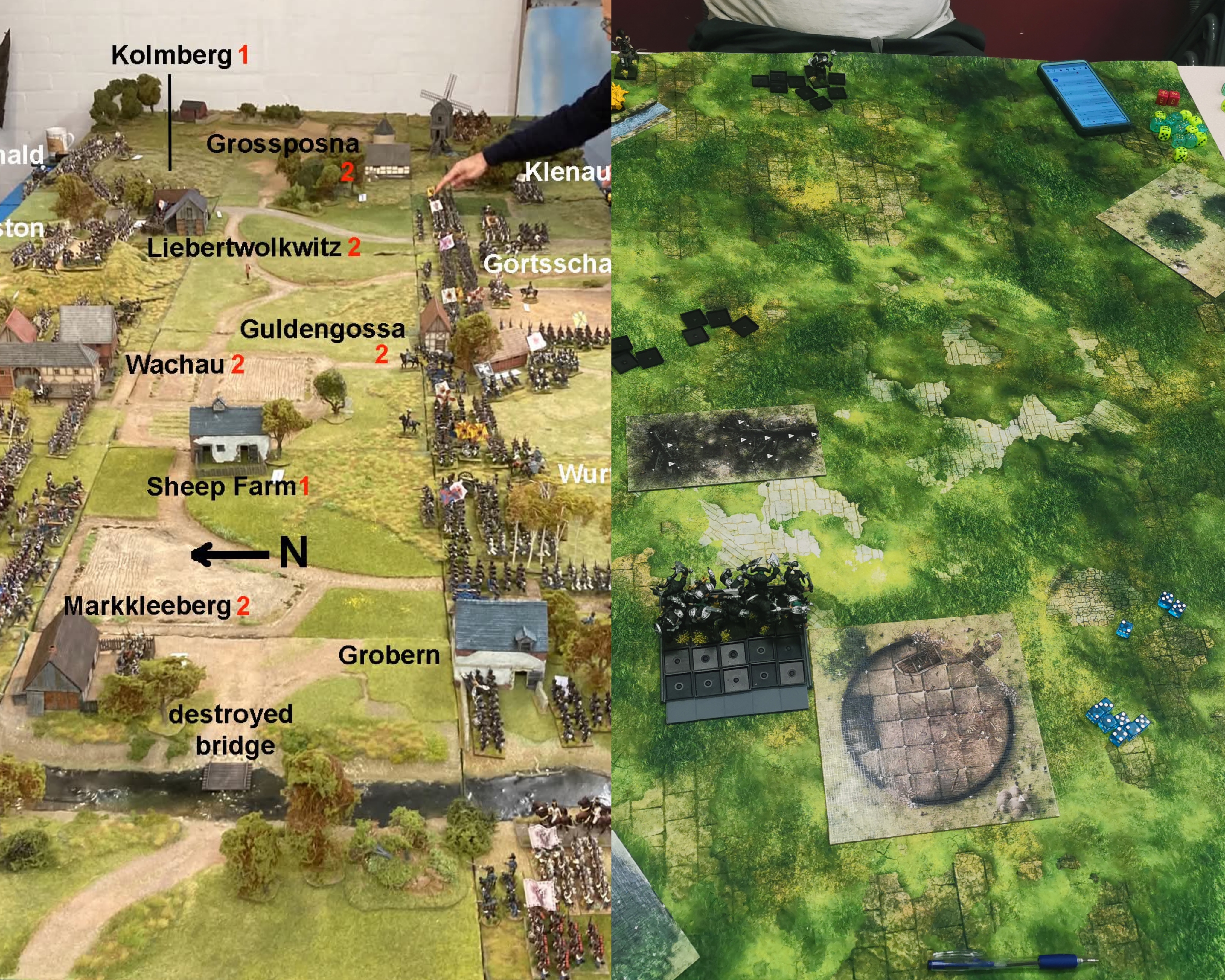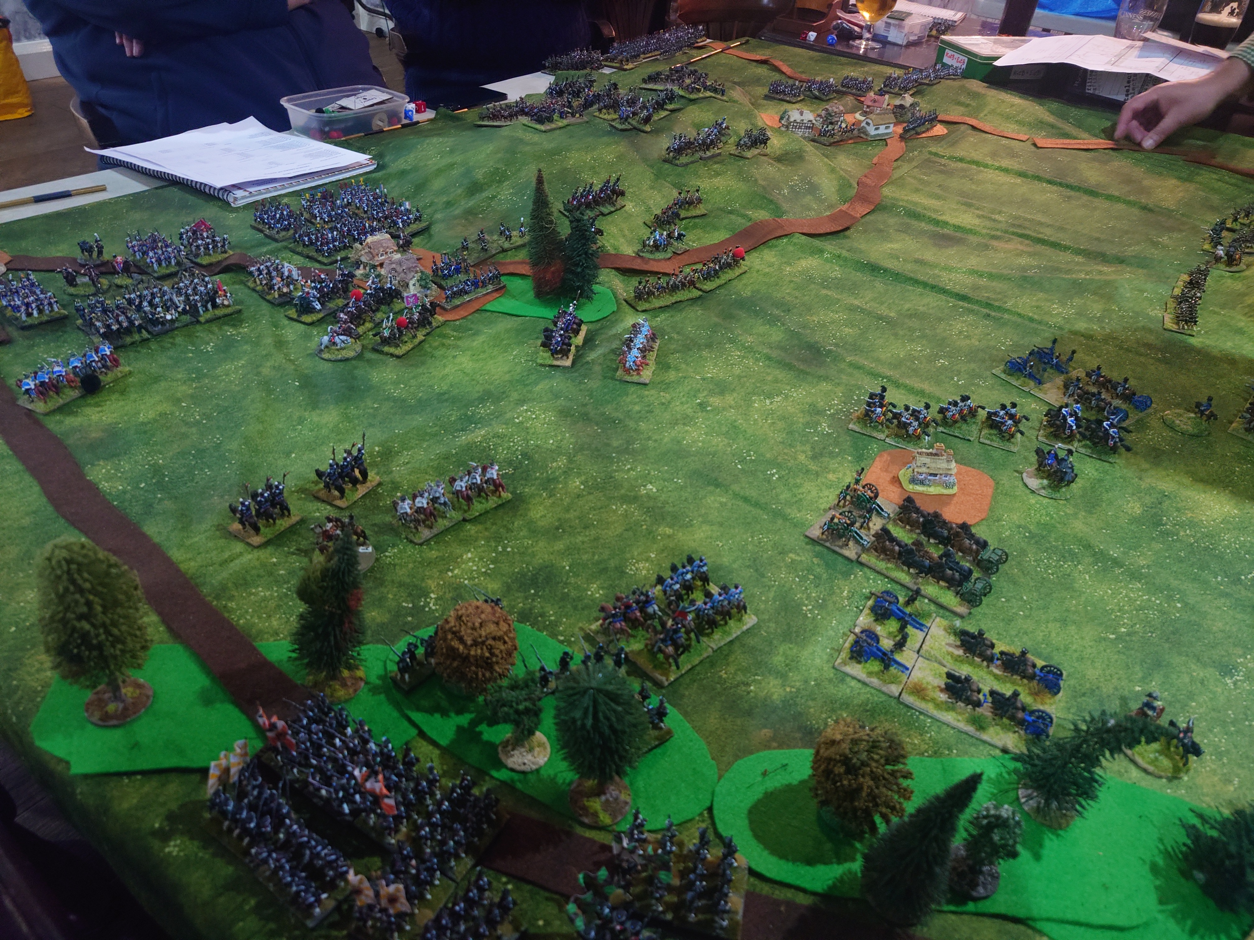 At Saturday’s battle of Eylau, the three divisions of Davout’s corps tried to roll over the Russian left flank and break their army position. The French started out with a numerical advantage, but the Russians had advantages in cavalry and artillery and received reinforcements partway through the game. The French pushed forward and seized and held the center village. After a small setback, the Duke of Scruggs managed to force his way onto the main Russian ridge. But on the other side of the battlefield General Solarviski used his cavalry to break a French column, overrun a grand battery, and flank a French division, breaking its attack and forcing its infantry into squares.With an imminent Russian counterattack expected on the main ridge, the game was called as a Russian victory. The action was affected by the bad weather. A rule designed to recreate occasional snow flurries limited movement, charging, and firing. Unfortunately, the rule got out of hand and hampered a lot of shooting and movement. It will be tweaked.