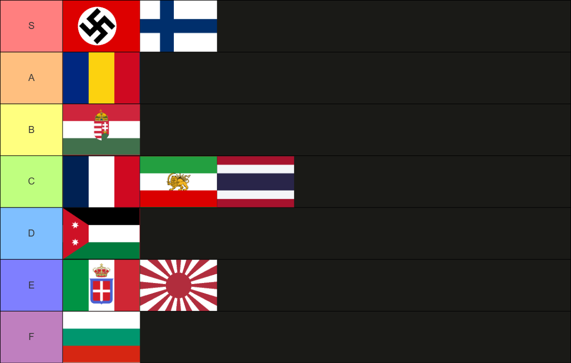 This is about Military action relative to their expected performance.Finland did less damage to the allies than Italy or Japan, however Finland is a recently independent, poor frozen backwater, Italy was considered a great power for 69 years before the invasion of France, in a position to deal a crippling blow to the Allies in Egypt.While Romania would be S tier if I was considering their oil sales powering the western Axis war machine