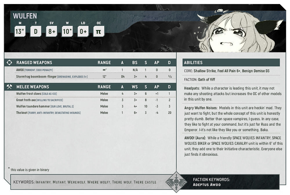 >>97453331>TQI tend not to buy ugly miniatures. I'd probably have to say either a squad of Infiltrators I picked up on a whim. If we're talking in terms of rules though, I do happen to own a Deathstrike