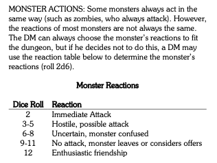 >Your 6 party members, weapons drawn and dripping with the blood of the bandits, open the door and see the Bandit Chief sitting at a desk>*rolls reaction roll*, gets a 2>The Chief says "Oh hello my friends, what brings you to my hidden base? Would you like some treasure? I'm feeling very friendly today."The OSR Experience.