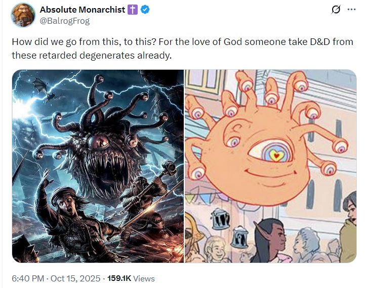 >>97471966On Twitter someone posted this with the 1e beholder stat block and something like "one of the beholder eye stalks can cast Dominate, and clearly he used it to dominate everyone in this town to become a faggot and force them to fuck for his amusement. His alignment is Neutral Evil so by definition he is forcing them to act evilly."