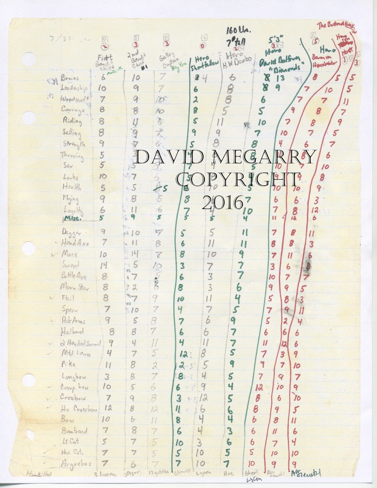 >>97471891>It sounds like Kask is talking about the period 1974–1977.>While Arneson is talking about later years, probably 1979–1980.I think it's the other way around: Arneson's game was not only older, but he's generally known to have been a lot more loosey-goosey (even to the point of, as the classic /osrg/ screencap states, playing favorites), and of course to a great extent out of necessity, since he was inventing the game as he went along. Just consider the well-known fact that in the first, or one of the first at any rate, Blackmoor dungeon expeditions all the PCs started as "flunkies" who died from the first chop received, until one of them (Bill Hoyt?) managed to take a magic sword and was immediately leveled up to Hero, capable of sustaining four chops: here the reader with a knowledge of Chainmail instantly perceives that Arneson simply had yet to create distinctions finer than that between Chainmail's ordinary soldier and Hero. Indeed, the Flunky-Hero-Superhero system seems to have lasted for some time in Blackmoor before more granular levels were devised, c.f. pic related, Dave Megarry's character sheet.In short, I believe that by the time Arneson was using granular levels (1972-1973?) many of the characters were understood to be level 8 or more; moreover he almost certainly gave out more loot than Gygax. (Mornard might have had something to say about this in his various anecdotes; again hard to check.) You can see in your clipping from FFC that Arneson observes about Svenson that he consistently refused to take risks and was thus "only" level 15 by 1977.As for how faithful Arneson was to OD&D, I should say not more than he felt like. It's reported that Arneson's players were happy with the publication of OD&D because "now we can finally see what the rules are", but we also know that Arneson resented Gygax not incorporating various of his rules into the published book. I don't think Arneson felt any obligation to adhere to the printed rules.