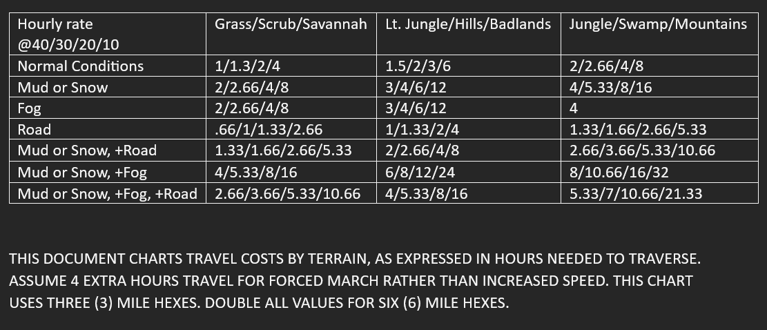 >>97482401>time-based dayYes?>>97482410Whats the issue here?This lets you know how much traveling youre actually doing when moving through multiple hex types.Other wise, every time you change hex types, you have to pro-rate remaining speed and modify it based on terrain type.With this chart, the math is the exact same as modified speed, but inverted so that you merely have to add up how many hexes youve moved through. Ex, at speed 90/30 you can cross 6 plains hexes per day, or 9 if you force march.Ex2, you start traveling at 120/40 an need to cross a plains, hill, and swamp hex to get back to plains. The hill hex has a road. This takes a little over four hours, leaving 3 more plains hexes that can be traveled.Using this has saved me *a lot* of time and trouble when hexcrawling.
