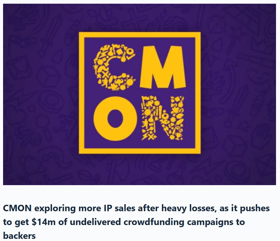 CMON is deliberating selling more IPs as they keep drowning in their dire straits. What will they sell next, and do they even have anything to save themselves anymore?>The publisher – one of the most successful board game crowdfunders of all time with over $110m raised – posted losses of nearly $7m in the first half of this year and another $3m across 2024, figures which dwarf the overall $4.2m profit it had managed to make over the previous nine years combined.>The company has been scrambling to stem the losses since the start of last year, laying off staff and halting new game development and campaign launches in March, and selling off a string of its IPs -including Blood Rage, Rising Sun and its most famous and profitable title, Zombicide – in the summer.>It followed that by selling the IP for former Mythic Games titles Anastyr and Hel: The Last Saga to Don’t Panic Games in September, and parting with the lucrative Cthulhu: Death May Die IP to Asmodee a month later – the latter a series which has raised almost $10m from backers to date.https://boardgamewire.com/index.php/2026/01/26/cmon-exploring-more-ip-sales-after-heavy-losses-as-it-pushes-to-get-14m-of-undelivered-crowdfunding-campaigns-to-backers/