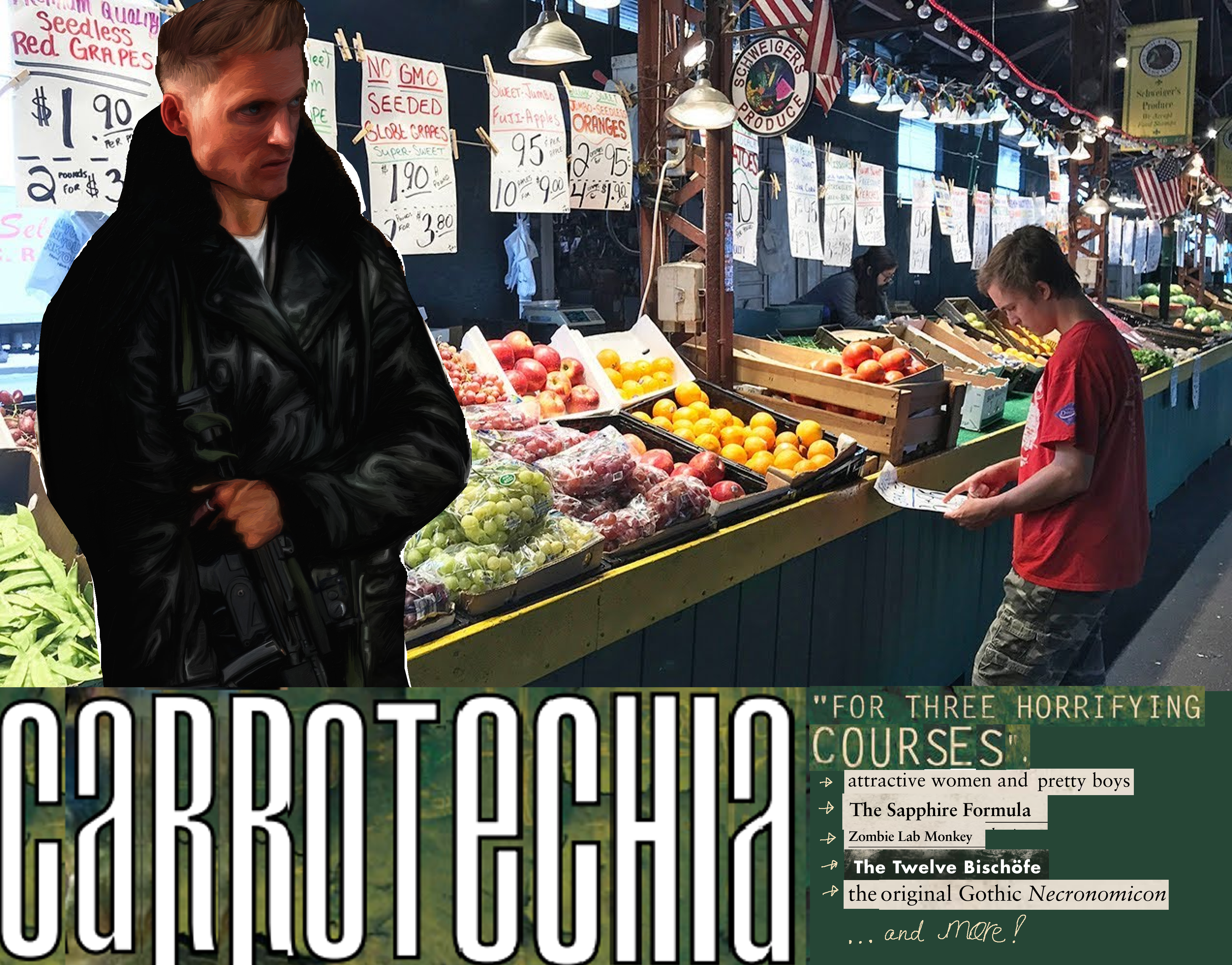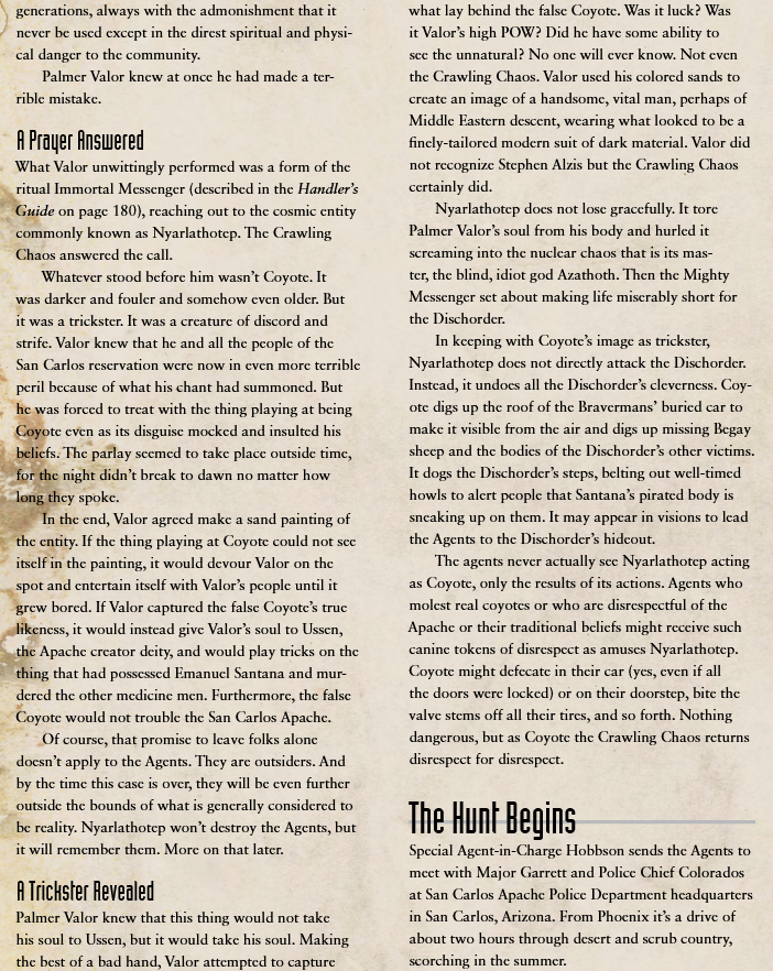 >>97481755Agents have been ordered to (Seedy) Milwaukee, WI to falsify a Target: the gospel of witches. The only way they can get to the Target is to visit the first location: a famous crack house, where their first clue - maps and sketches - points toward a second location - a nostalgia-inducing dentist or yoga center - and the activities of the Antagonist - Qu-Tugkwa - and its Minons - half-man/half-animal.At the second location they find their second clue - an illegal laboratory - (and potentially face off against, be waylaid by or otherwise evade a nuisance: being seduced), which leads them to a third location: an out-of-the-way university/research laboratory. Here the Minions set up a trap: a summoned Monster. By sheer luck or pluck, the Agents deal with the trap and thereupon find their third clue - a strange dreams.This clue leads to the Target, which either directly or indirectly explains the the Antagonist's and Minions' machinations: become something unnatural for further unspecified, otherworldly aims, which requires an artifact. By leveraging their assets or using previous clues, Agents can now find their way to the a forgotten green box, where they can defeat the Antagonist once and for all.