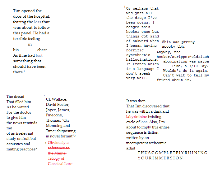 >>97673474>This dog-shit scenario design, don't do this.Yep, but that's what the generator directed as the form of that clue - 'a strange dreams'.I was hoping we could workshop it a bit in exactly this fashion, to improve around the constraints of the generator.Perhaps the illegal university lab was originally using Gospel of Witches as a source for some sort of psychiatric or sleep treatment, and there are patient treatment records that discuss the coming of a terrible person (describing Agent Drill) and then a closure order or declaration of federal investigation in the name of (AKA Agent Drill).The generator doesn't really do node-based scenario design, it is set up for linear, but it wouldn't be too hard to back-fill some branching clues, and even easier to foreshadow a bit - like have the crackmens wall scrawl call the !dentist "Mr Drills", or one of the older dealers talk about sneople and drug trials amidst the other jabber.