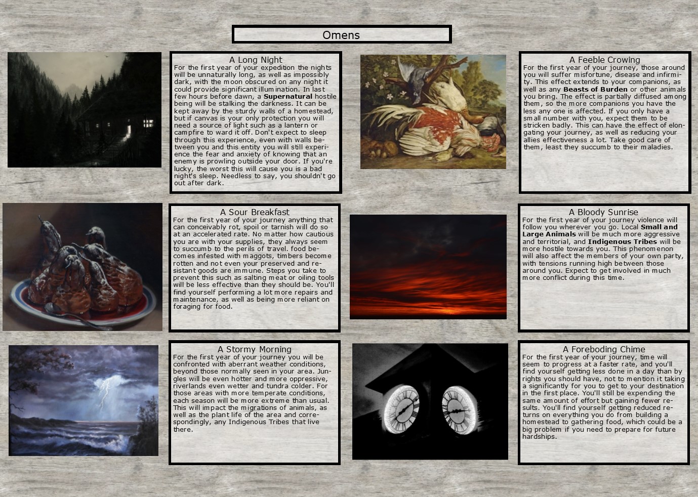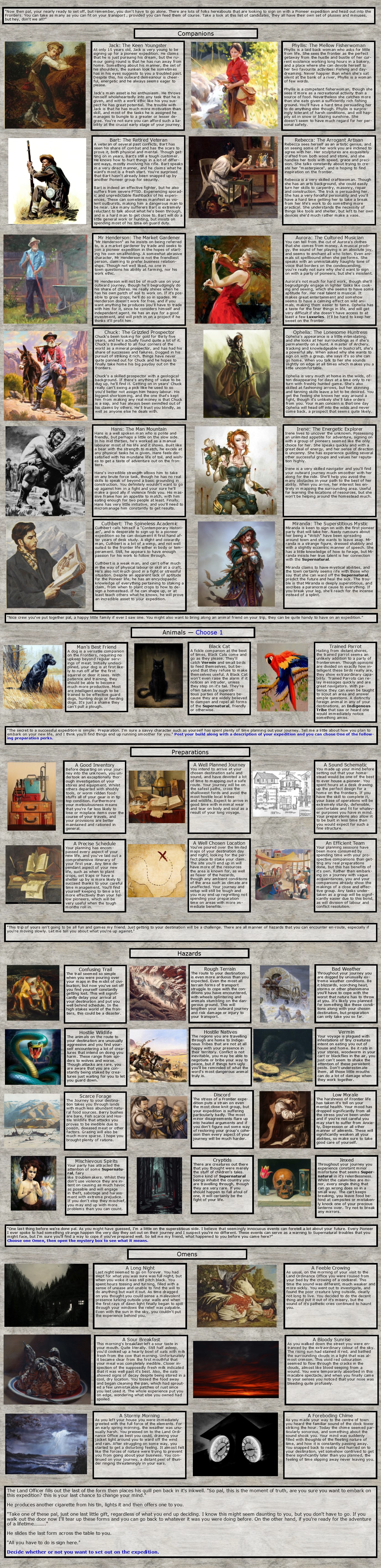 >>97483909Destination: Eastern Temperate ForestTransportation: Covered WaggonSpeed: Medium (4 Hazards)Cargo: 9Budget: 8Passengers: 5Supplies:>Seeds (Free)>Rations x5>Hardware>Plough>Luxuries>Basic ToolsEquipment:>Woodworking Tools>Farming Tools>Traps>Lanterns>Paper>Books>CrossbowSkills:>Hunting>Husbandry>Mysticism>Pottery>TailoringHobbies: PaintingSeason: AutumnDreams: MonstersMotivation: AdventureCuriosities: Corn DollyCompanions:>Jack>Mr Henderson>Hans>Irene>MirandaAnimal: Man's Best FriendHazards:>Mischievous Spirits>Cryptids>Rough Terrain>Hostile WildlifeOmen: A Long NightMy chances, bois?