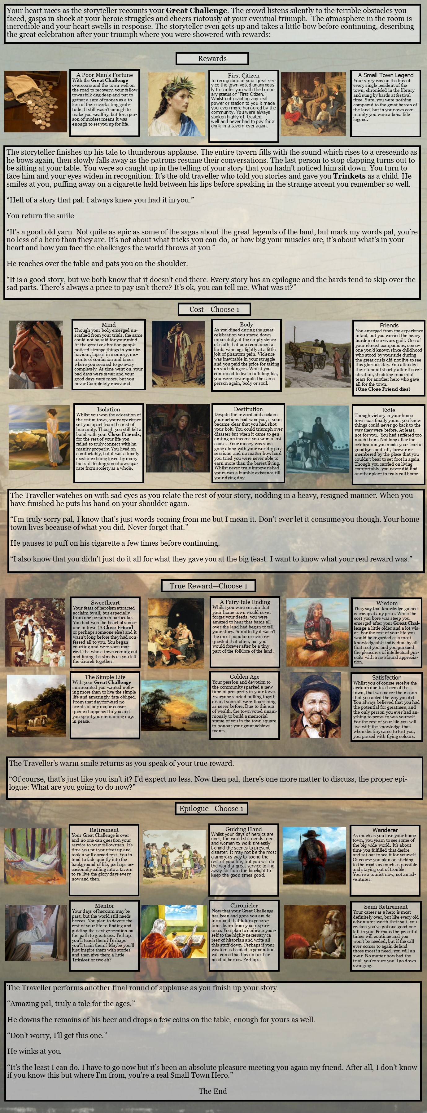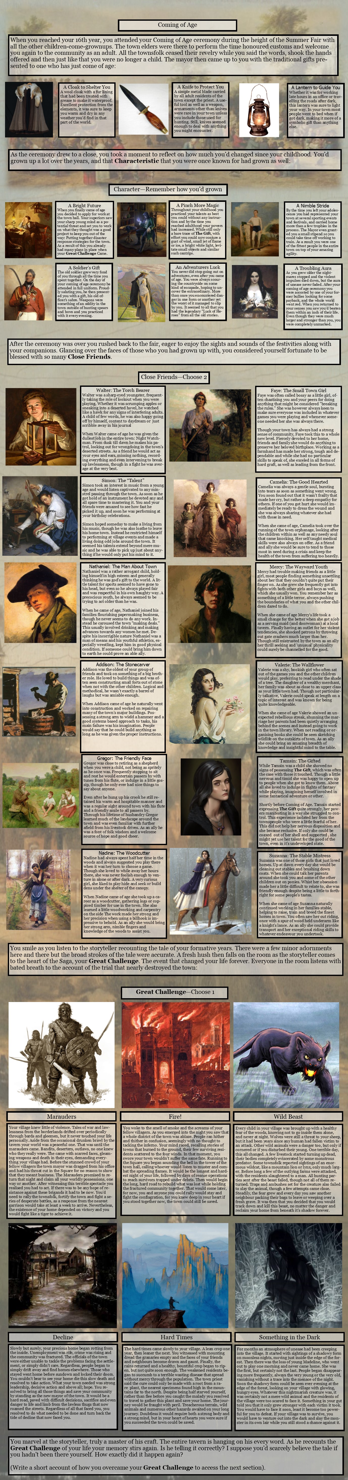 >>97483919Location: A Historic Town, +1 TrinketCharacter: A Whiff of MagicTrinkets:- Silver Locket- Family Tree- Stuffed Gulltraits:- People Person- Wayfarer- Night OwlComing of Age: A Lantern to Guide YouCharacter Growth: A Pinch More MagicClose Friends:- Tamsin, The Gifted- Nadine, The Woodcutter- Gregor, The Friendly FaceGreat Challenge: Something in the DarkA strange if affable wanderer. Eyes forever set on a distant horizon.>>97484227Sometimes.But not for any of these guys.