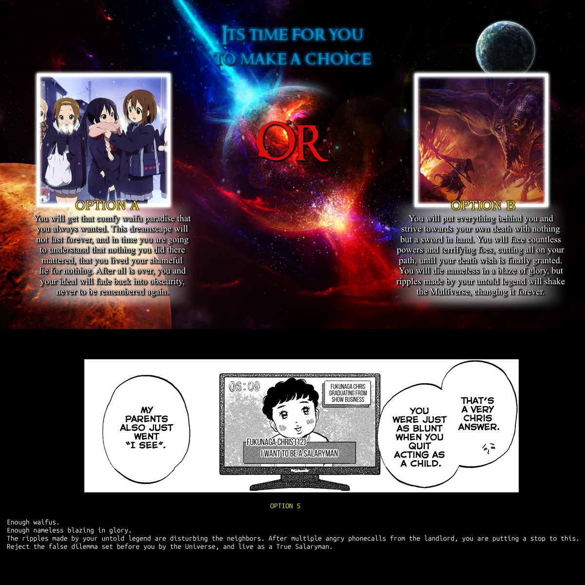 >>97487681It depends on where my heart leads me when the CYOA becomes real I suppose