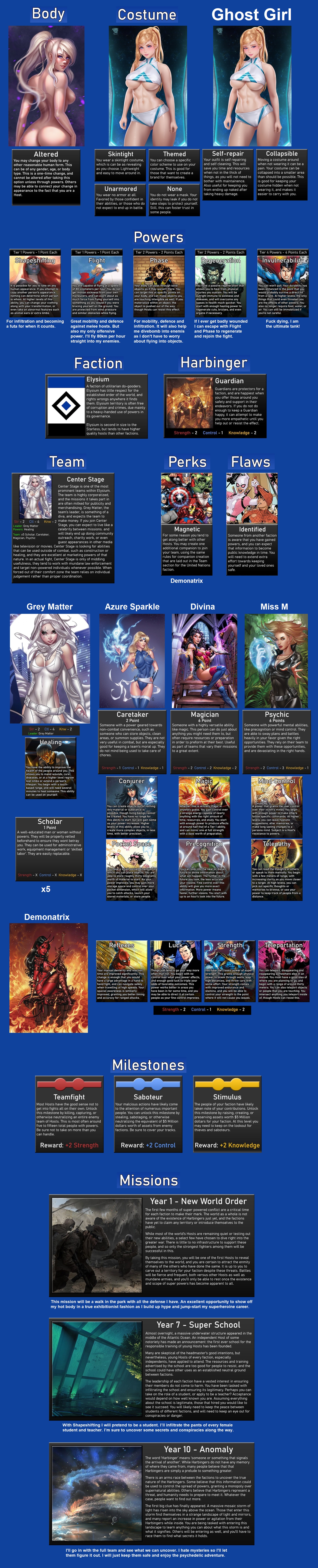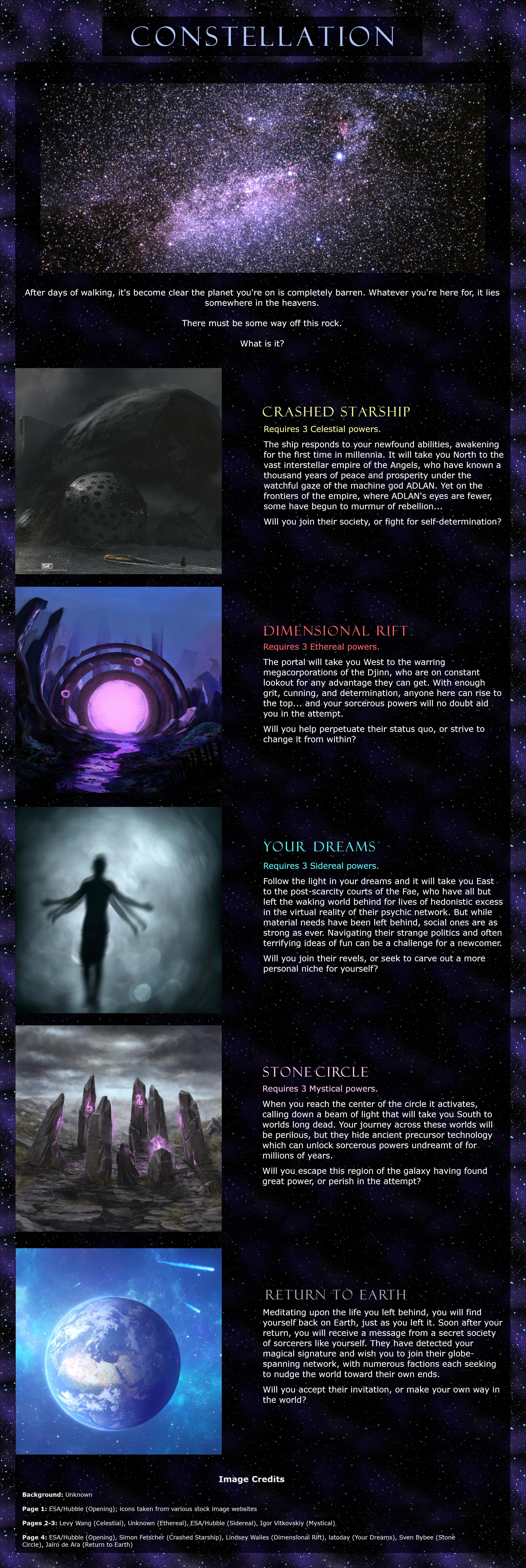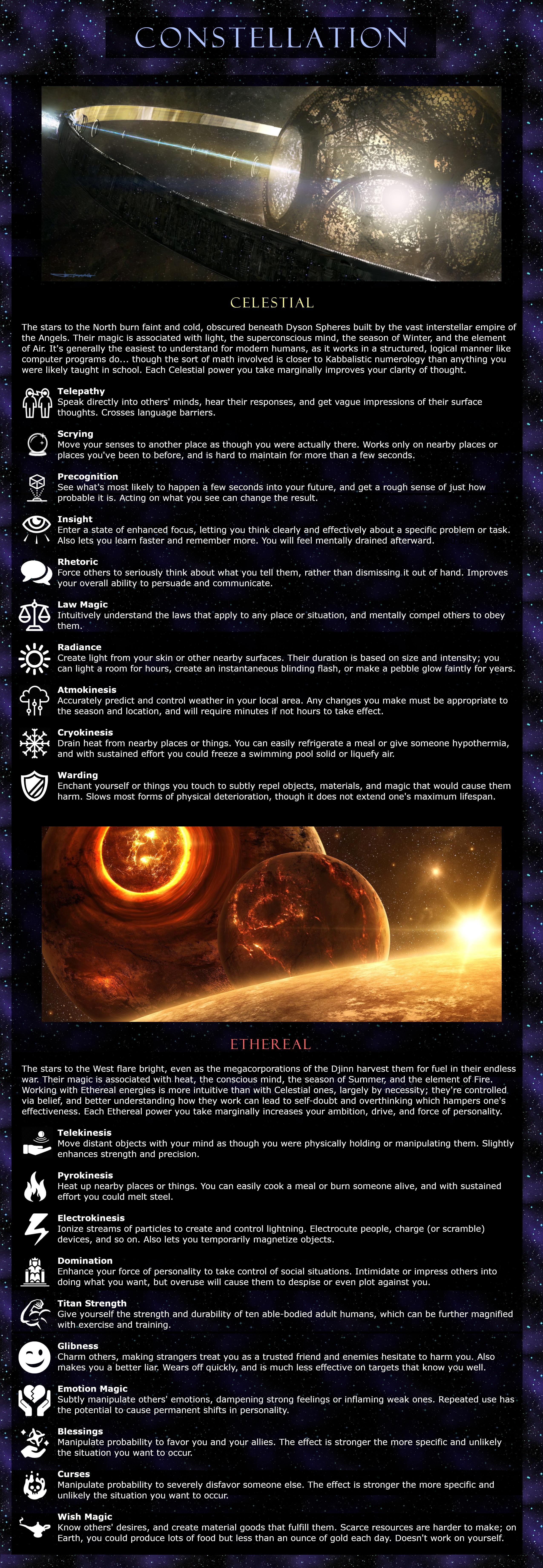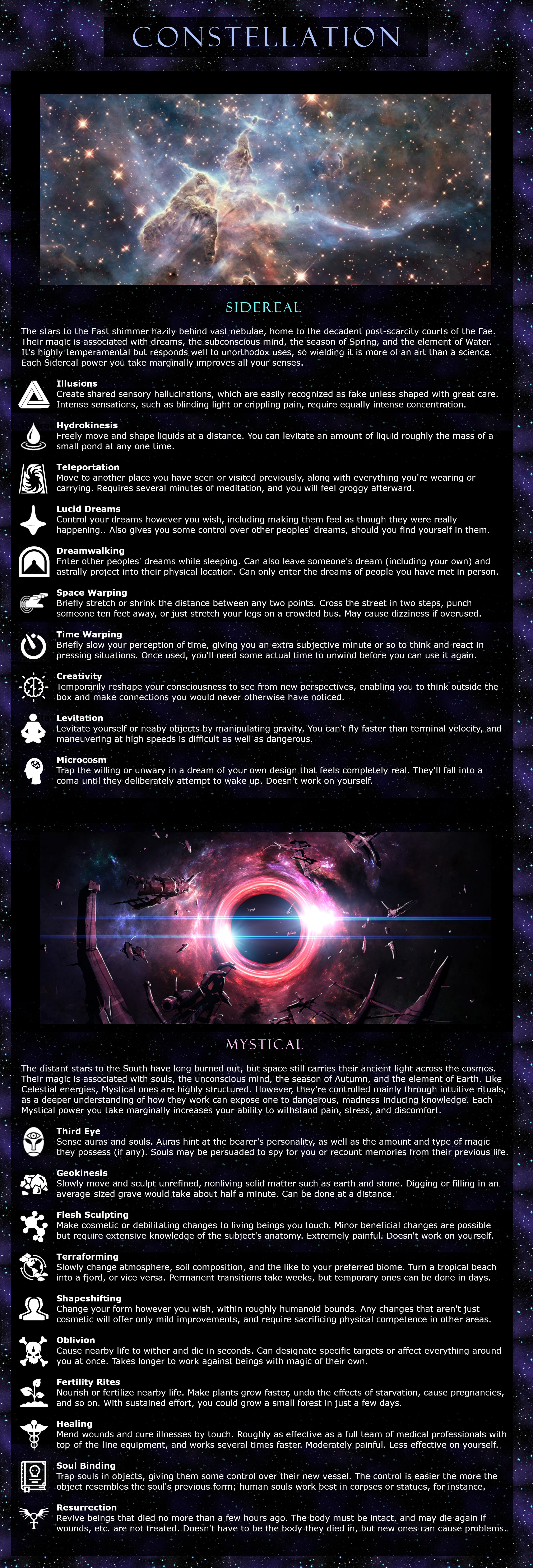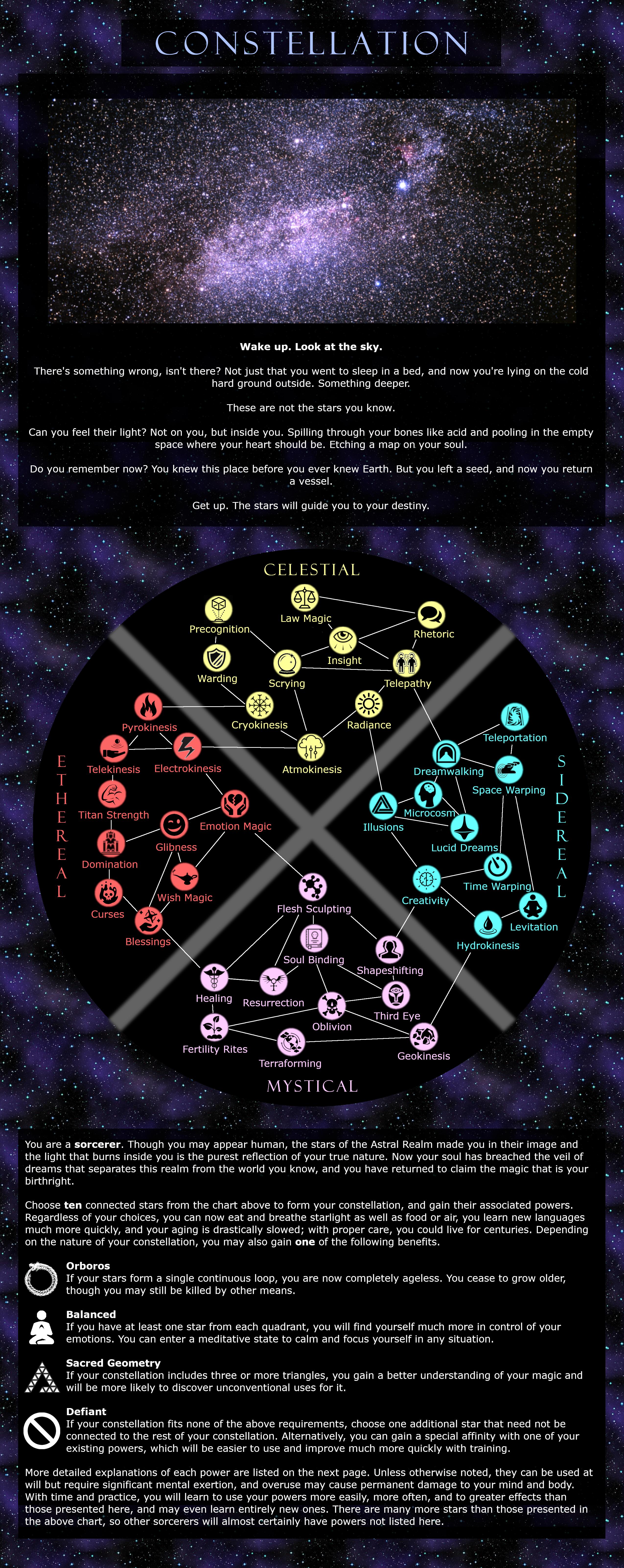 >>97488478>ConstellationMystical: Healing, Fertility Rites, ResurrectionEthereal: Blessings, Wish Magic, Emotion Magic, Electrokinesis, Pyrokinesis, Telekinesis, Titan Strength>BenefitsDefiant - Healing Affinity>JourneyReturn to Earth