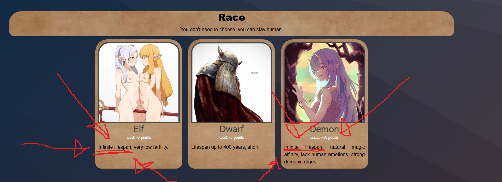 >>97488206He's self-conscious that he hasn't made a new SFW cyoa in years and wants us to give him credit for making a big cyoa, even if it's a /trash/ cyoa.