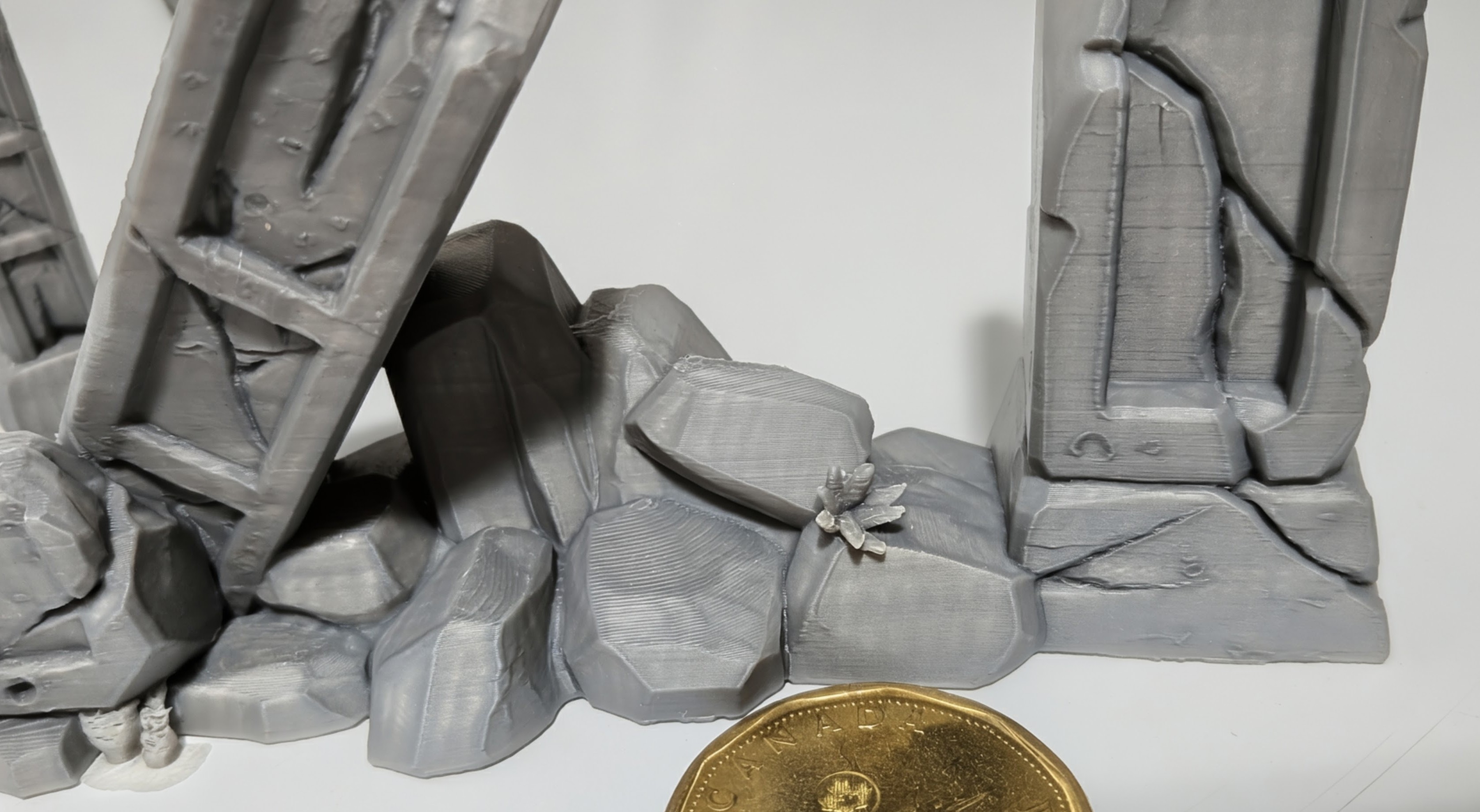 >>97482051canadian loonie (26.5mm) for scale. took 24h to print 5 pieces of terrain using ~100g of filament but i can't even see the layer lines without the macro lens