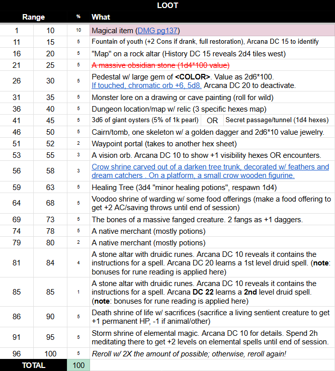 Sharing my treasure/rewards table to contribute to the thread. Even though I'm calling it "loot" on the pic, its not really loot from monsters/encounters, but rather something that has a chance of being encountered in the wild (which might be potentially surrounded by mobs)Any additional ideas for rewards that are not magical items and/or valuables (gold/etc) are welcome!PS: as most of my tables, this is a dynamic table and I change it depending on what is found (once an entry is found, I might reduce its % or replace it with something else)