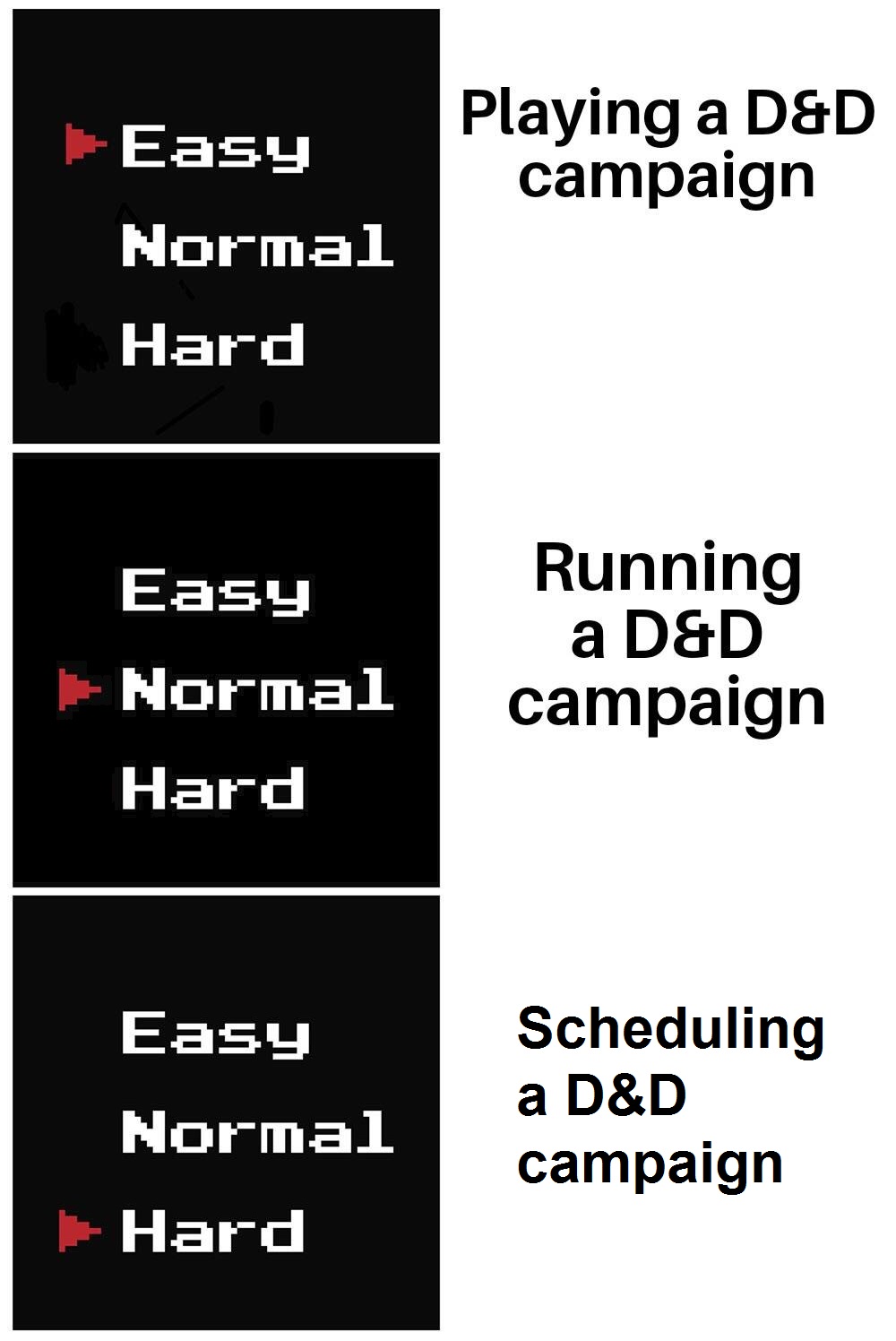 >>97498241>D&D is a good systemEh, arguably>5e is trashIts polished trash. It streamlined a lot of things and made play easy, but it also went even deeper into DnD's main flaws. Overall, I prefer it over 3e>5e is especially trash for hexcrawlingFor hexcrawling yes, its not built for it so objectively you're right. However, factoring the West Marches component of having new players all the time, using a well known system is a MAJOR advantage>Your game will fizzle out in a month or less due to """burnout"""Let's see! I might burnout as DM cause I'm doing tons of prep, though I'm hoping most of the prep is only during this initial phase. The players, on the other hand, seem all excited enough to survive the 1 month threshold (for the 3-months threshold we still gotta see how things go). Note that we barely started (15 days ago) and I already had to turn down sessions (plural). So the demand is real, and being DnD its likely to keep up, because even if most current players burn out, there's a large pool of new players available>The only good D&D editions for this type of game are TSR editionsNever played TSR editions so I take your word for it that they are good/better. But note that they being better for this doesn't make all other options unplayableAlso, again, are you factoring *teaching* those editions to new players? How long does it takes to teach it?If it takes:>more than 15 minutes to teach new players>more than 4h research to learn how to DM itThen it's already a pass