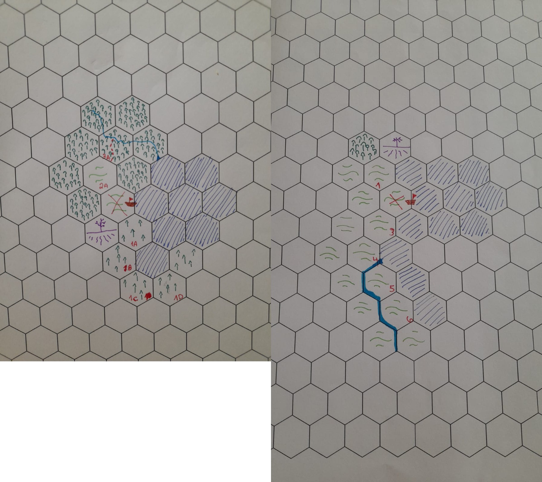 SooooRan the 3rd session today... this was potentially the best session I *ever* DM'ed (I've been doing it ~20 years)Nevertheless, I will focus on highlights regarding the campaign, WM or/and hexcrawl highlights:>3 players from first session (aka "the gnomes")>1 player from second session (aka "the barbarian")>1 new player>gnomes immediately started interacting w/ the barbarian and organically asking more about what happened on his session>great WM dialog coming up organically, such as:B: "on this river we found a warrior from a native tribe, we should find more about them. He fled upstream"G: "maybe we can travel upstream by boat... actually, Mr. Barbarian, you have been there... how is the current there?"B: "oh, very fast, it will be hard to go upstream"G: "alright, so instead we might go by land and use the trail you guys trailblazed last session">players thus decided to investigate more about the natives>players decide to use the services provided by PCs not in the session (see >>97494339)>the augury revealed that the next hex upstream was "good vibes">they found 2 native women>no combat, just a long & interactive encounter w/ them (they didn't speak their language)>some tensions, lots of laughter, lot of knowledge learned>native women told party about the new hexes (pic related, right is post-session)>native women also told that jungle belongs to an enemy faction>they even managed to convince one of them to back to camp w/ them>that woman will now be a npc players will be able to interact w/ off sessionI seriously couldn't predict a more dynamic and smooth session, with such storyline progression and player engagementVERY excited for tomorrow's session (1 recurrent player, 5 new ones)