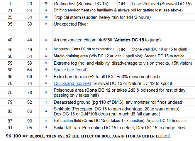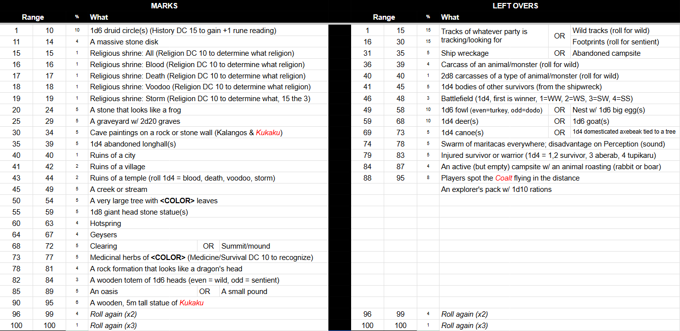 OP here... not sure I mentioned but I created a discord and I'm trying (pathetically) to get players to engage there. The idea is to use the discord to:>have one unified place for all of the campaign-related discussions>have things, especially session reports, properly available & organized>eventually have things PCs can interact with on their downtimeRegarding the latter, currently there's an event going on where a native woman from that island has joined their camp (>>97496962)>>97505544>TSR editions of the game aren't too difficult to teach to new playersI'm not saying they are, that's the point! I'm saying that teaching ANY new game, regardless of how easy it is, its still more than not having to teach at allThe overall point being that, due to the (somewhat unfortunate) familiarity of DnD 5e, using it means that often I don't have to teach it at all. Unfortunately I often have to teach/remind people of basic rules, but I plan to work on that regard to reduce that effort as I go with this campaign>there's anything wrong with using 5e if you're enjoying it and it's working for your purposesI think its more of the latter - its working for the purpose and, changing systems require a lot of prep (re)work for the DM, which I rather invest into making additional prep (boy do I love prep & making props)>>97505580>WHat are the 3 columns?>Range and %?I mean... it's kinda of obvious?>% is the chance (out of 100) of that event/thing happening>Range are the exact numbers (on a 1d100 roll) for that to happenBasically, something that has a 10% chance of happening, will have a range of 10 different numbers on the Range columns. More importantly, I used formulas so that I don't need to keep reworking the ranges - I choose the % and it calculates the ranges based on what comes before and after>Can you share the full table with a link?That's the full table and no, respectively. It's my personal DM files, it doesn't make sense to share actual access to it