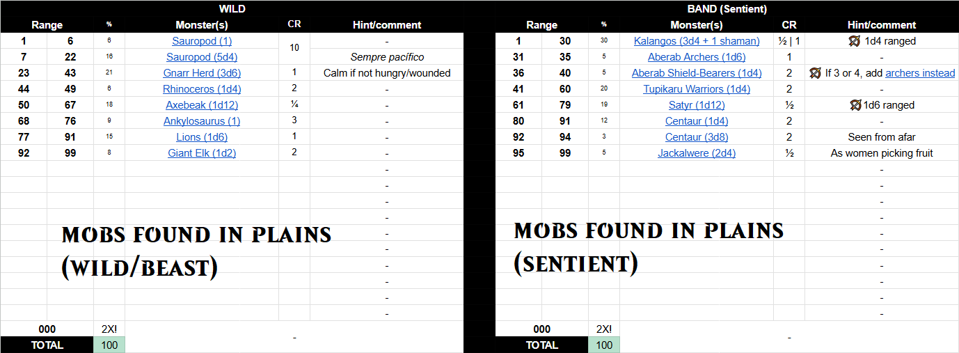 >>97497807>I lost all my tables when my laptop friedI'm sorry anon, this is indeed sad. Though desu, also a bit silly you didn't use something like Google Docs/Sheets for that... way more practical. I started using it because I can work on my stuff on either my desktop or my laptop (the one I actually use during sessions). Also, additional points due the fact I can hyper link stuff (my tables are on a Google Sheets, but statblocks are on a Google Doc... so I link it and can easily jump from one to the other)>I had 100 entries per terrain typeAt first I was overwhelmed by the idea of making a huge table, but the following steps helped me (in case they may help you recreate your material)>started actually making sheet formulas so that I can simply input the % and it already calculated the d100 range>this sound silly, but the trouble of updating the range for each entry over and over again would make it so much more troublesome>this also allows me to use higher % than just 1 entry per %>for wild, I went to the DND 5e DMG pg 302 to get some suggestions>for sentient, i added 3 main setting mobs that are present on every biome (though at different %)>filled the rest with biome-specific sentient racesIt took me a couple of hours, but I got it done. I think one core aspect here is that I made it in a way that I could make initial tables faster (for early sessions) but could easily update them later. With the d100 formula, I can easily adjust the likelihood (%) of a given mob/encounter, or even add new entries. I think its easier to build only the necessary first, then add to it as you goFor non-mob encounters (like the landmarks/etc I shared), I tried to at least add 20 events to force some sort of creativity out of me