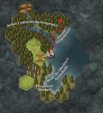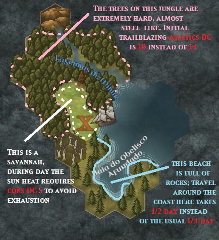 >>97497807Split my posts and forgot to tag you on >>97498177Also, let me use this extra post space to just comment that in 3 sessions, my players (10 so far) only really been to 3 different places:>1st session they traveled south around the coast of the Bay of the Sunken Obelisk (1)>2nd session they traveled north through the savannah (2), and then into the yet-nameless jungle (3)>3rd session they went back into the jungle, learned about the hill north but didn't get thereNote that despite no new place explored on 3rd session, it was a REALLY good session (see here for details >>97496962)In terms of number of hexes travelled:>The hex w/ X is the camp - they start from there so it doesn't count>The single savannah hex northwest has been travelled x2>In the jungle north, only 3 hexes have been travelled, one of them being travelled 4 times (if you look closer, there's a small red dotted line going towards the river - that hex has been travelled enough that it is considered a marked trail with easier travelling)>On the beach south, they travelled through 4 hexes, each onceSo in total:>They travelled 12 hexes in 3 sessions (4 on average)>Only 8 hexes have been visited (the 12 total travel is considering re-visited hexes)Given my estimates on >>97498177, we can see how wildly different our approach is! While I calculated that on average they would find something in your campaign after ~24 hexes... took my players 3 sessions to travel half of that!!>ps1: only 2 combats ever took place>ps2: both were avoidable lol, one obviously so lol
