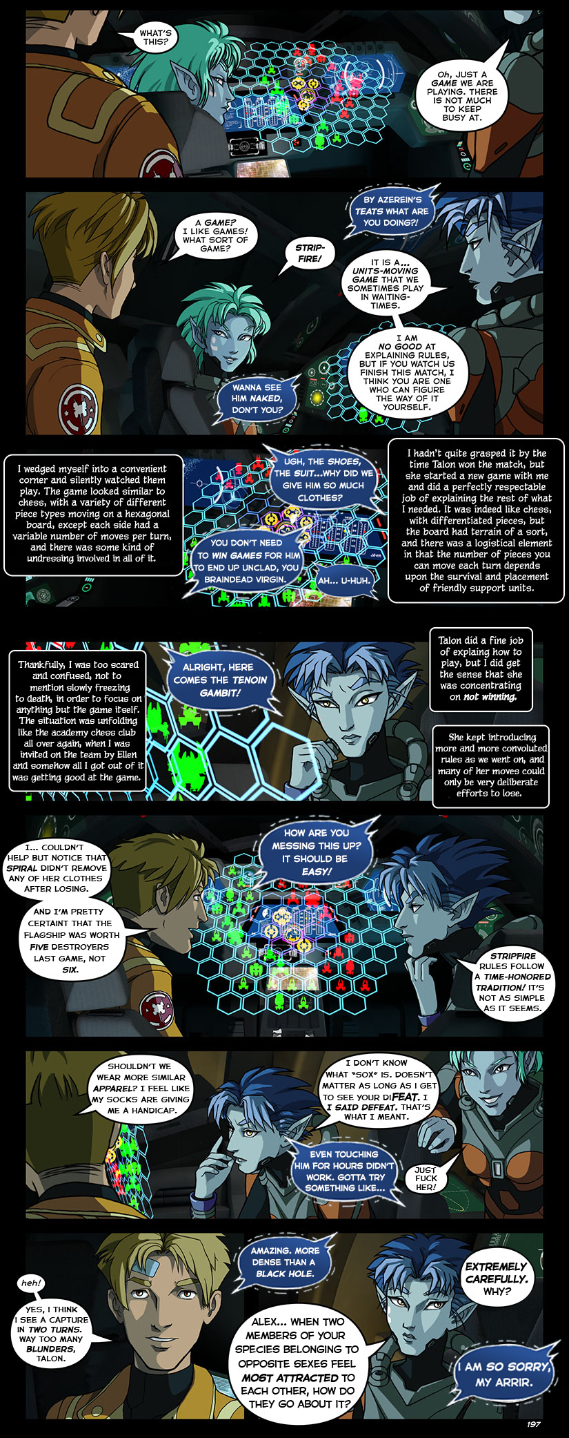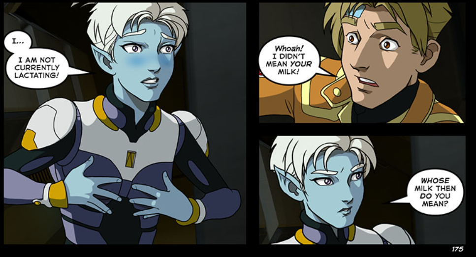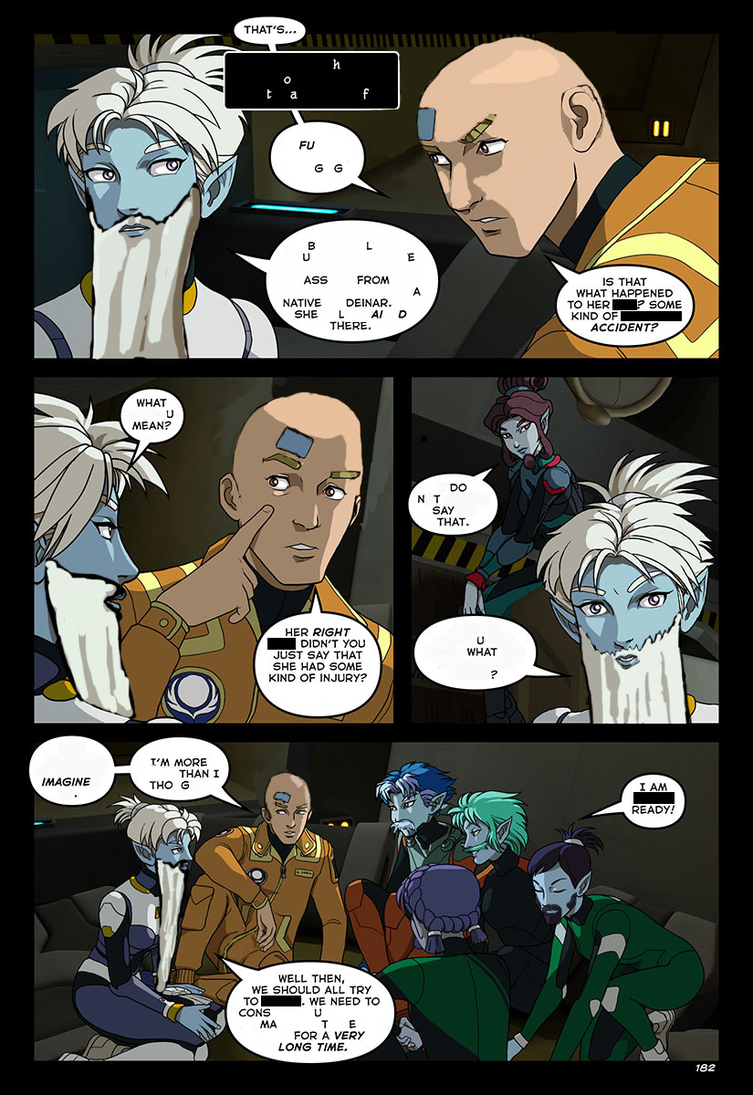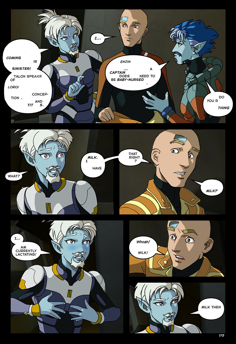 >>97501298What I find really underappreciated about this scene is that it had strong establishing setup on page 167.When Talon accused Beryl of trying to "baby-nurse" Alex, look at her goddamn lips. You just know, for a fact, that the version of this conversation she's got going on in the background is MUCH more graphic. Between their minds she's probably accusing Beryl of actually starting up an embarassing lactation cycle and trying to get him to latch on.And then, just 8 pages later, he says THAT.This is the sort of shit that makes the yearly re-reads worthwhile.