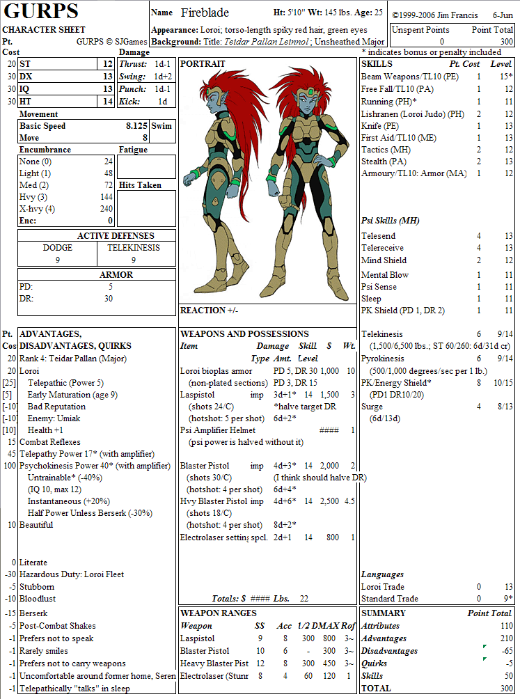 >>97543677I believe the hard line for a Teidar is the ability to kill an enemy at some arbitrary distance, which could be done with low power and high precision or high power regardless of precision. Mizol require other skills and aptitudes, someone with both a Teidar's power and those Mizol qualifying skills would be able to write their own ticket but Mizol are more valuable.>The spy lady has some limited psychokinetic ability as wellThe spy lady has a non-amplified Telepathy power of 15 and the ability to dampen electromagnetic sensors or disable EM-vulnerable devices per >>97488819 -- she is one of the only characters who might be able to remove Historian construct possession from a ship's computer, and if she were to receive an amplifier equivalent to Fireblade's then she would have a TP power of 30 which is basically godlike.Fireblade's Telepathy power is listed here >>97492146 as 17*, and the asterisk refers to her telepathic power being doubled by the amplifier; her native telepathy power is only 8-9, same as the average Loroi. Since she sleeps without her amplifier on, her telepathic dreams leaking into Alex's brain cannot be a matter of raw telepathic output, only poor control.
