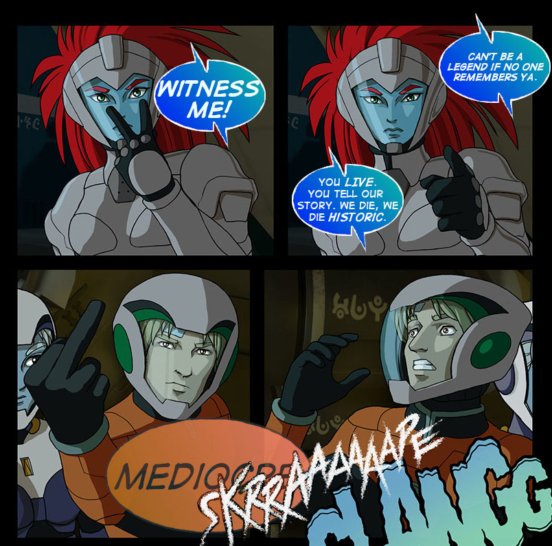 >>97497522>whenever they reach the planetThey will never be allowed to reach a planet.Every single time he has shown us a planet visual the art style changes to hand drawn backgrounds. The artistic purpose of the comic was described many times as a long experiment in drawn characters merged with 3d modeled backgrounds appropriate to the 3d modeling technology that was accessible when the comic started in 2001, and or when the story outlines were drafted in 1997-99. I have never seen an author statement indicating that new expansive story arcs were planned to refit the story to the capabilities of modern technology. That means Unreal Tournament levels, not Unreal 5 jungles. Industrial mechanical, interior spaces, at most oil refinery on blacktop.Planet time would be a pacing sandtrap anyways. It's bad enough that each chapter takes a decade. Who wants to spend a whole decade in the 'Alex learns to meditate and talk about his feelings' arc?>>97498449>when he is in a state of deep relaxation or close to unconsciousnessUnconsciousness seems extremely helpful but relaxation in any sense beyond muscles going slack seems unnecessary. His first vision of Fireblade was in an agitated and fearful delirium from which he woke up screaming. It was also an agitated night terror that saw him slip into her dream. Tension woke him up in a fit during the planetary nightmare, but that tension was there the whole time. His more recent visions of Fireblade were under combat circumstances, and in both of those his hostility towards her is stated. We have no evidence that he is particularly helped being at peace; when he saw Fireblade mentally in the shuttle he was not at peace, he was hostile to 'the harpy.' His cooperation is unnecessary, only his delirium. The correct experiment for human telepathy will be for Fireblade to grab him and begin drumming on his skull to simulate the delirious terror and resentment he has had in past telepathic experiences.