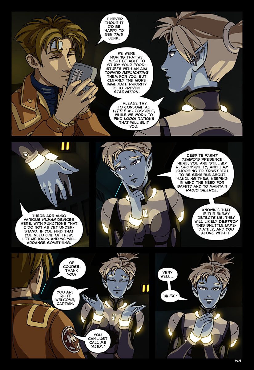 >>97500538>Loroi have a strong, cultural aversion to lies and Tempo has not told Alex a single falsehood.The Loroi aversion to lies is orthogonal to falsehoods. The Loroi spoken language from their barely-verbal warriors involves a rich tapestry of falsehoods, as demonstrated by "this will be cozy," "the whole shell language is naught but clicky clacks," and Spiral saying "not so!" in response to it being said that she has bad command of Trade or when she said she is the better player at Crossfire. Spoken falsehoods don't raise moral outrage.What does raise moral outrage?Tempo, being "insincere."https://well-of-souls.com/outsider/outsider068.htmlAnd Tempo has repeatedly been insincere."We mizol have many functions" comes to mind. "I take full responsibility for any indignities you suffered" and her shuttle talk about his solitude being for his own good seem likewise suspect.