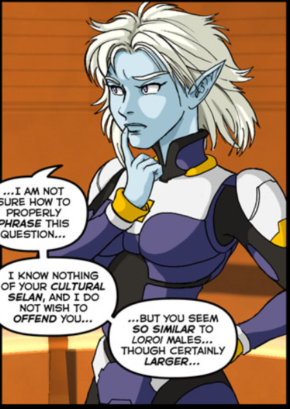>>97509385That's where human and Loroi culture differs. The Loroi have a huge taboo about casual touch. They would never just casually hit somebodies shoulder or poke at somebody like humans do. But when they do touch they don't draw nearly as much of a distinction between types of touch as mankind. Two humans holding hands is pretty significant and implies a romantic and sexual connection. Two Loroi holding hands is just part of a normal friendship. Compare how easily Talon and Spiral break the touch barrier with each other and how Talon recoils from Beryls hands.The Loroi place more importance on the telepathic connection part of skin-contact than on the physical sensation. Without telepathy, sex with a human might feel physically pleasurable, but it just would be lacking what really makes it fun.As to why none of the Loroi aboard the shuttle seem xenophobic, that is because they all volunteered to watch Alex when he was still on Tempest. They were selected for not being xenophobes. Alex got plenty of dirty looks on the bridge.