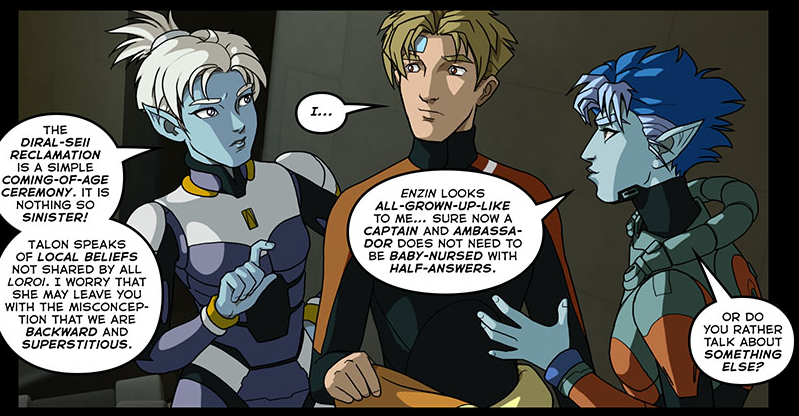>>97500623Best example:Everything the Clearbrook captain says in >>97499441 is completely factually accurate. But none of it is sincere and that drives Talon into a flurry of spacist slurs.