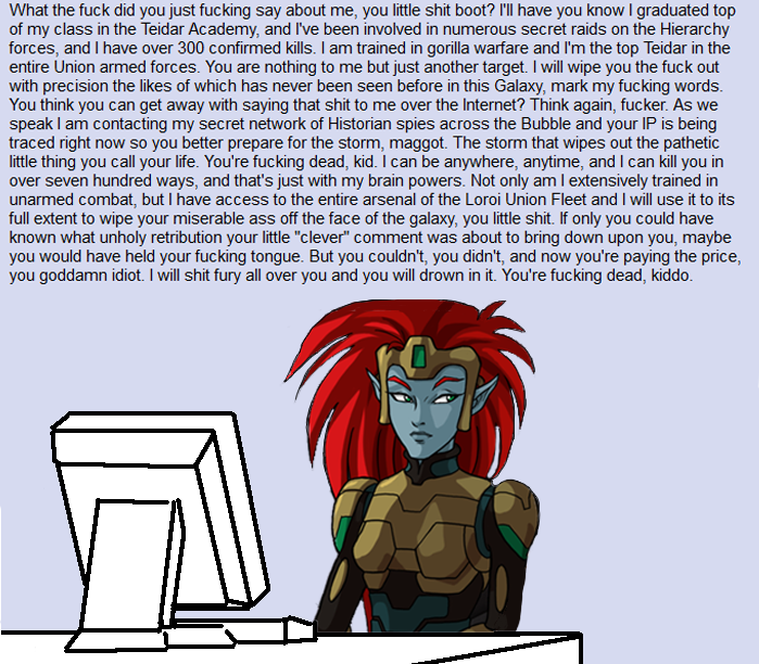 >>97489386>Every single one of those dorks and femgooners gave her life for him, specifically.I like that the corvette captain they were supposed to rendezvous with decided "fuck this, I'm out" and retreated in face of the enemy. Shows that not all elves are impossibly brave when facing certain death.