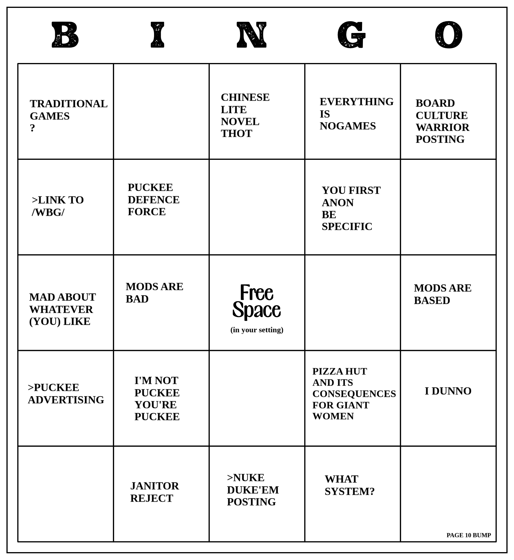 >>97488188Typically Bingo needs 5 in a row. Not sure there's enough going on with these to make a card.