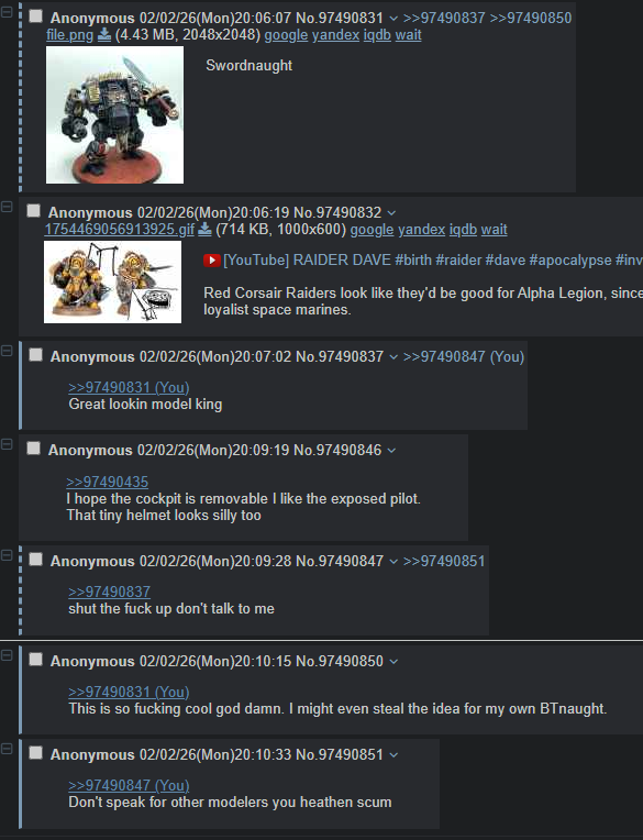 >>97491669>There is nothing more corrosive to the enjoyment of 40k than this place. Modelling, playing, lore and anything else because less enjoyable the more time you spend here.This is true.