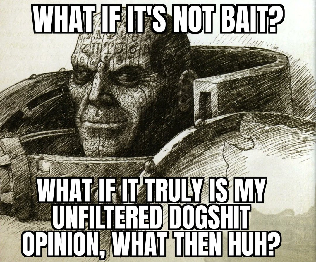 40K seems fun and I love space king and the lore tidbits I get here and thereBe honest with me, since 40k is rather social, are the people like the ones on reddit, like from what I get from the setting it’s not a “they are making fun of you chud” thing, it’s just an overall cool setting, over the top grim dark, like because I sometimes go on the space king sub reddit to see news about the show the shitty grim dank dubredit thing appears and it seems insufferable, I genuinely don’t think they understand the setting and are copping about something, it’s not the nazis or something, it’s just grimdark or something like that, it’s rule of cool