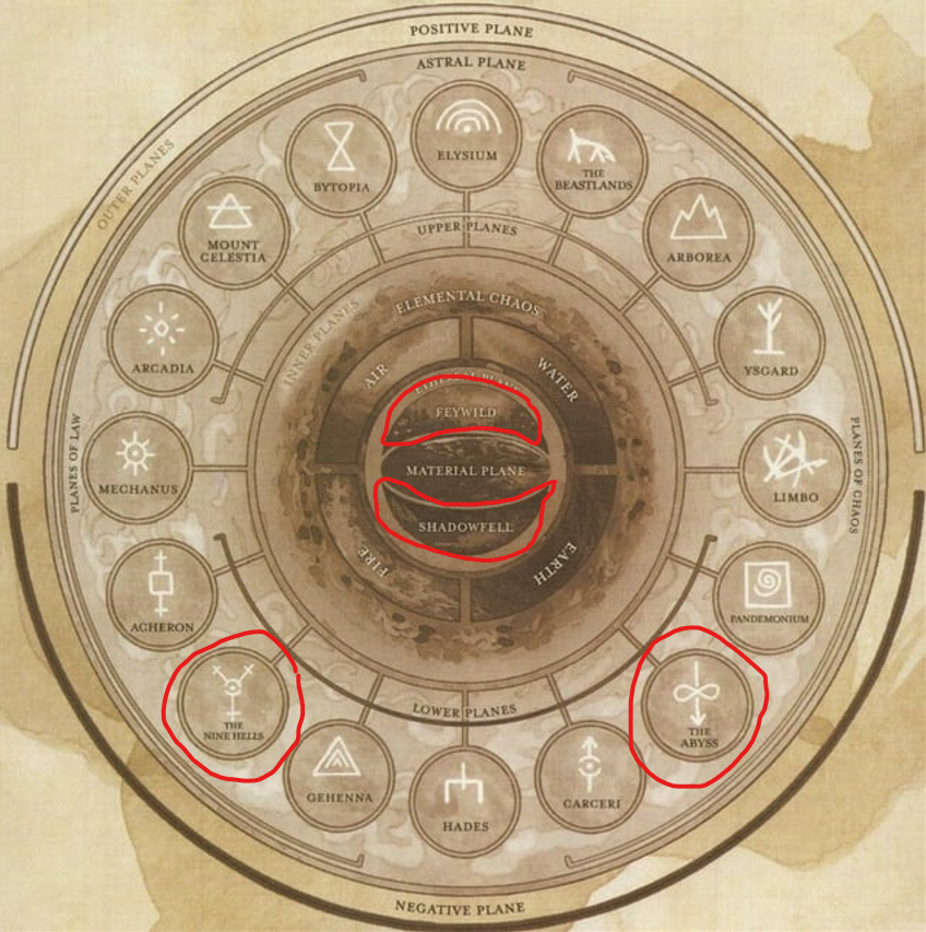 >>97492141I mean the Material's not circled and that's pretty commonly used. Ysgard and the Beastlands for some oneoffs can work. Acheron and Mechanus have potential Gehenna and Carceri can be fun but Hades is so explicitly the boring plane it's not very fun. Not a huge fan of Limbo or Pandemonium. COuld not tell you anything about Elysium through Arcadia other than "Mount Celestia has a mountain."