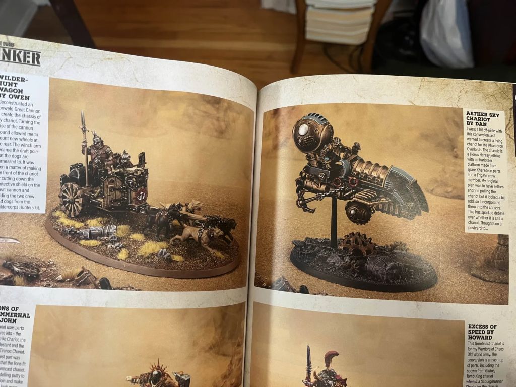 >>97494511I think the main gimmick of chariots and the like in aos is that they're (more easily) able to power through and move through hostile units that would usually force them to engage and thus prevent them from moving.>>97494648Kino ideaI've seen a fair few idk chariot conversions around (picrel), it seems like a concept that speaks to people. Gw would rather give them 2 extra characters and a spell though.