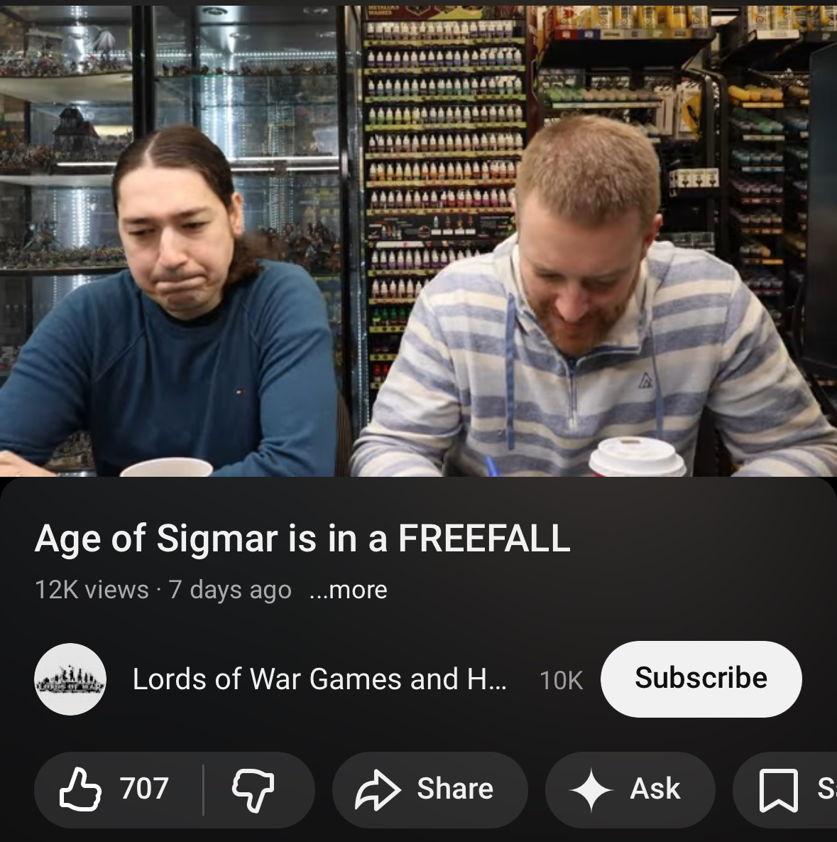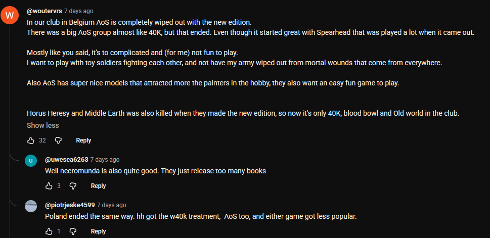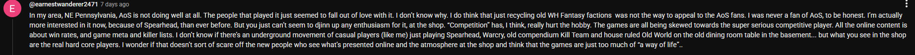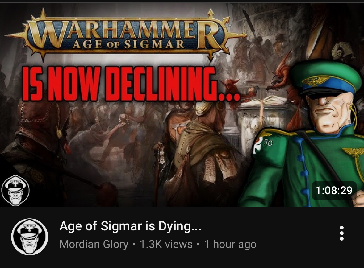 >>97505885>>97506318>>97506360A few days ago the largest third party store in Europe did an interview via a Youtube video and attested to AoS struggling sales wise since the release of ToW. I am starting to not feel so good. This store is like a mega chain that accounts for like 1/50th of all GW revenue in the world.
