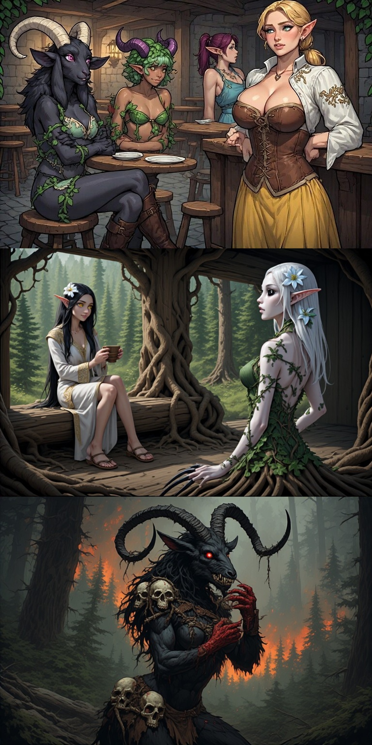 >>97500441Three nights later stones the size of horses flew towards the camp. The first fell short, and the fourth wide, but the others landed amongst the men. The 5th and final must have hit it's target as the legs of the trebuchet collapsed from a glancing blow. A unit of outriders were dispatched quickly to find the assailant in the forest but their horses froze upon seeing it throw the final boulder then turn to look at them. Before it could act further, they watched as a pale horrifically dressed elf walked from the forest, touched the leg of the 20’ tall beast, and they walked away disappearing into the brush. The Black thorn brayherd now had a Cygor.Misgens for this bit. https://files.catbox.moe/u18aa7.jpeg - cute but wrong in many ways. Only ever prompted 3 characters, but got a 4th in the background for free very often.https://files.catbox.moe/r46nbh.jpeg - a bit too tall, and 3 eyed instead of Cyclopean.