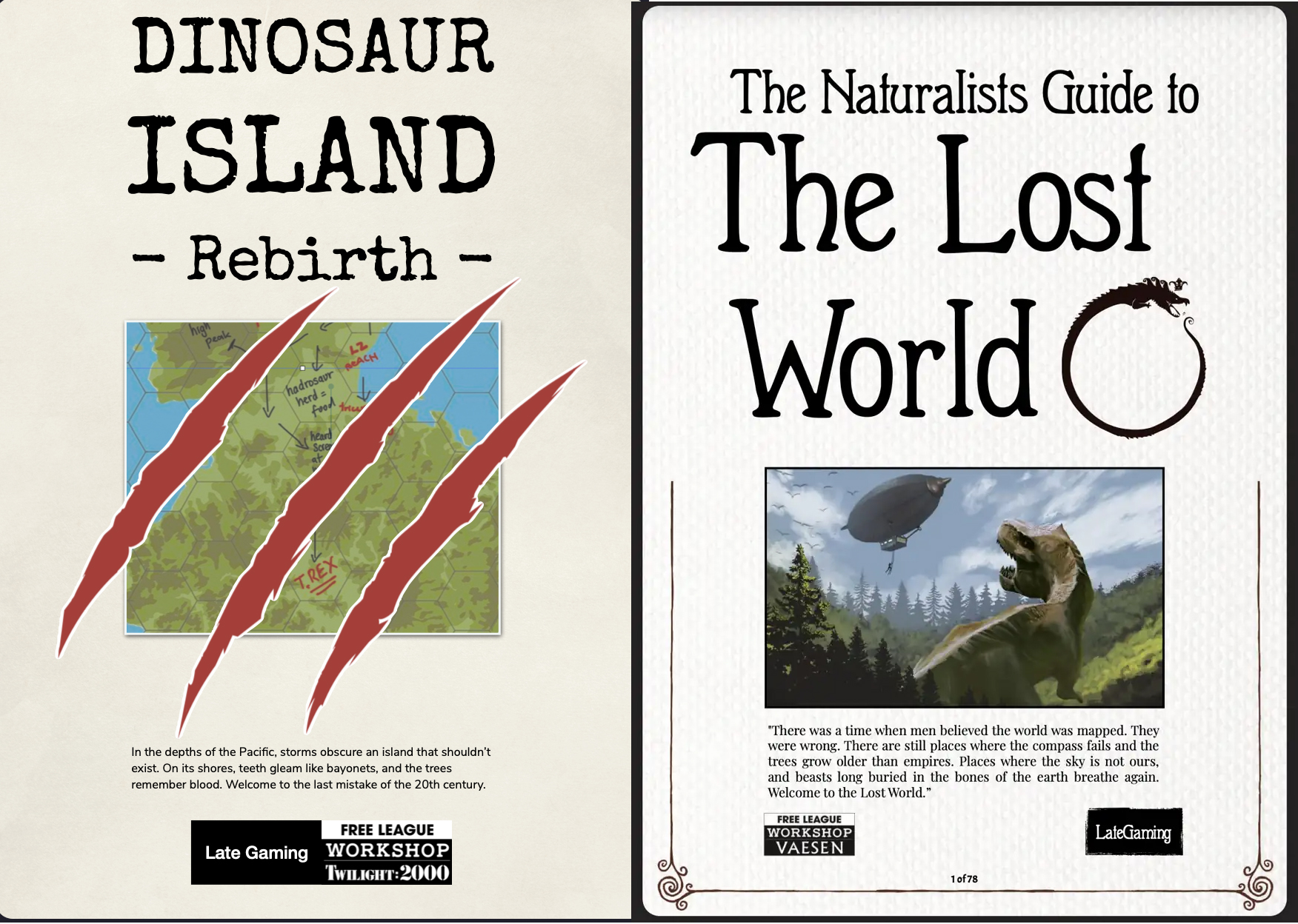 Looking for these two Free League Workshop releases:Naturalists Guide to the Lost World for Vaesen&Dinosaur Island for Tk24e.