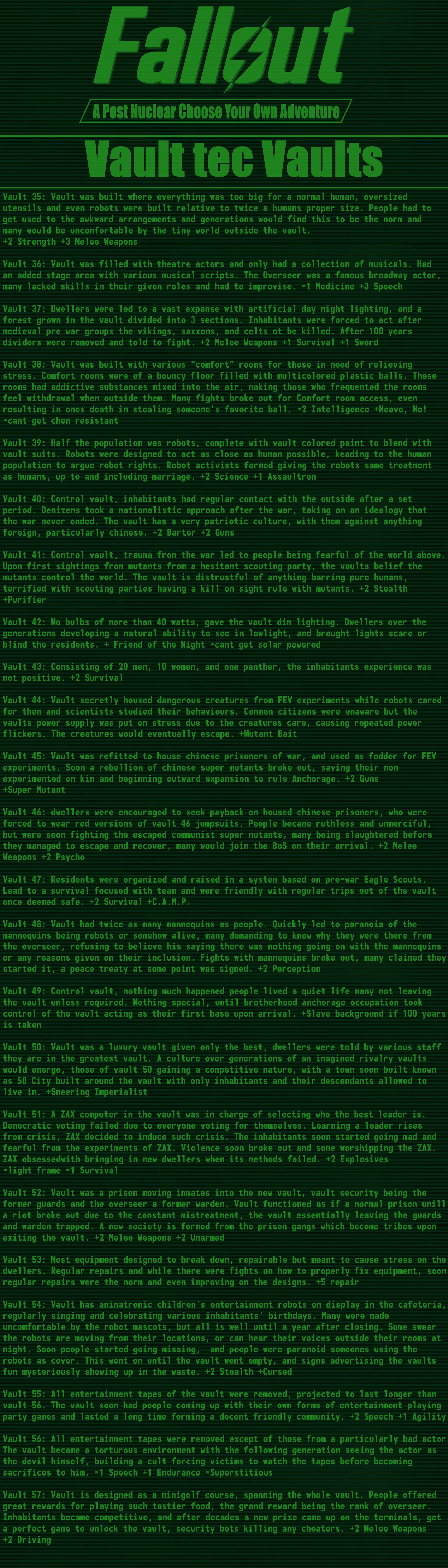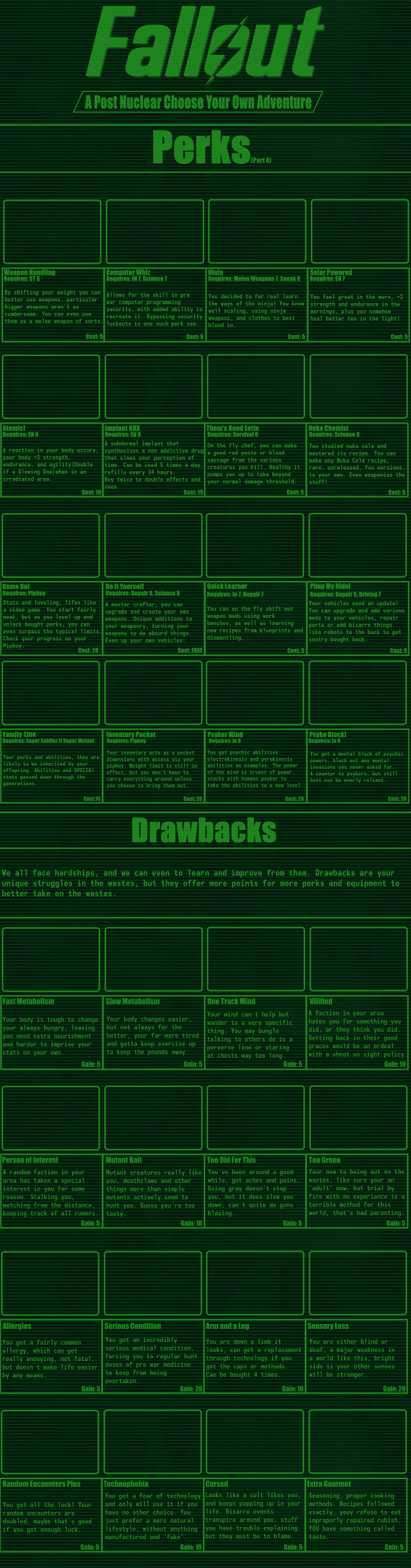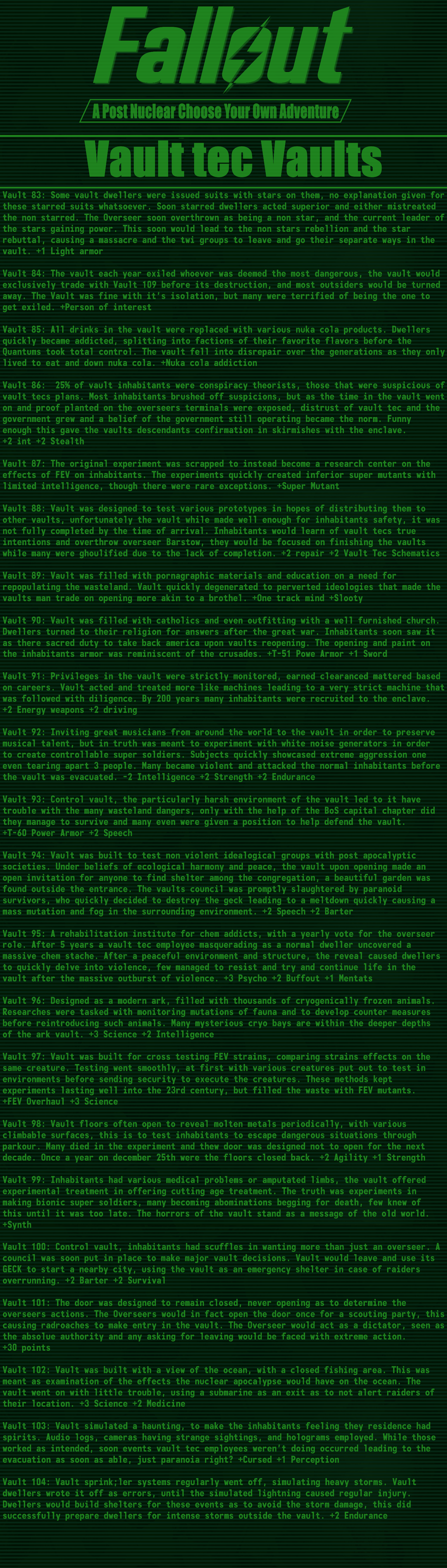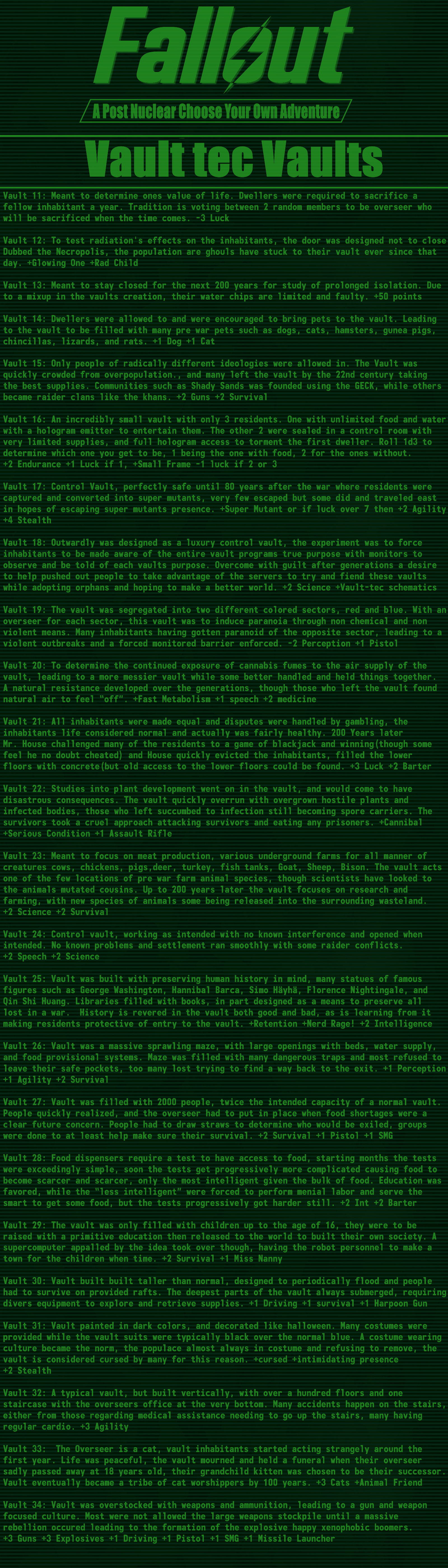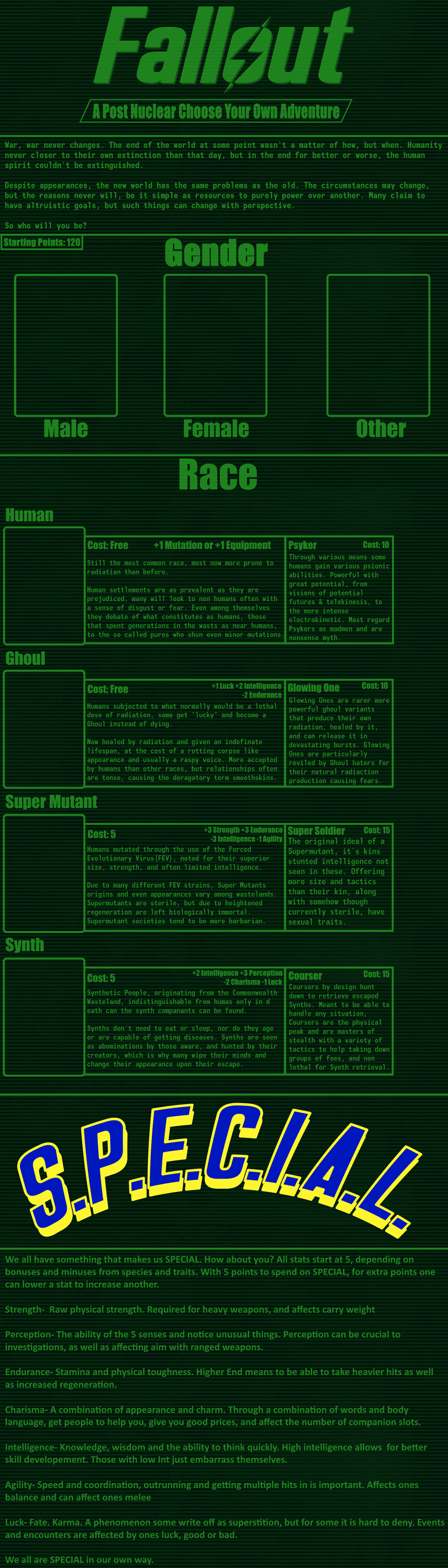 >>97514536good cyoa but it pisses me off so much that the race descriptions mean nothing:>super mutant -> super soldier: "it's kins stunted intelligence not seen in these"ok, so then give me back my intelligence points.>synth -> courser: "coursers are the physical peak and masters of stealth"still has the same stats so it means nothing, you just wasted 15 points for this.