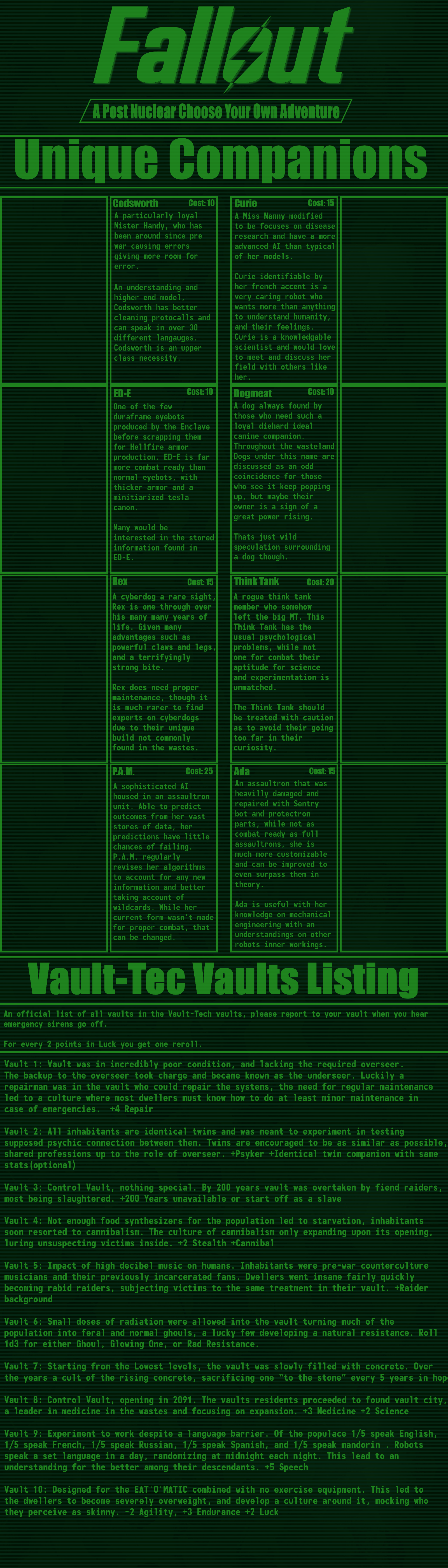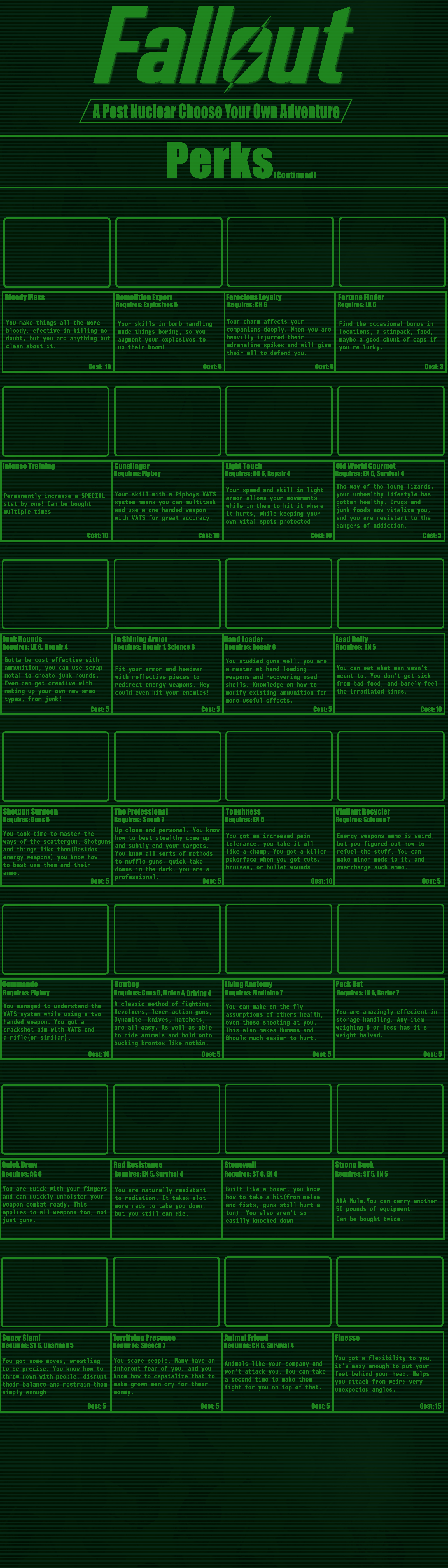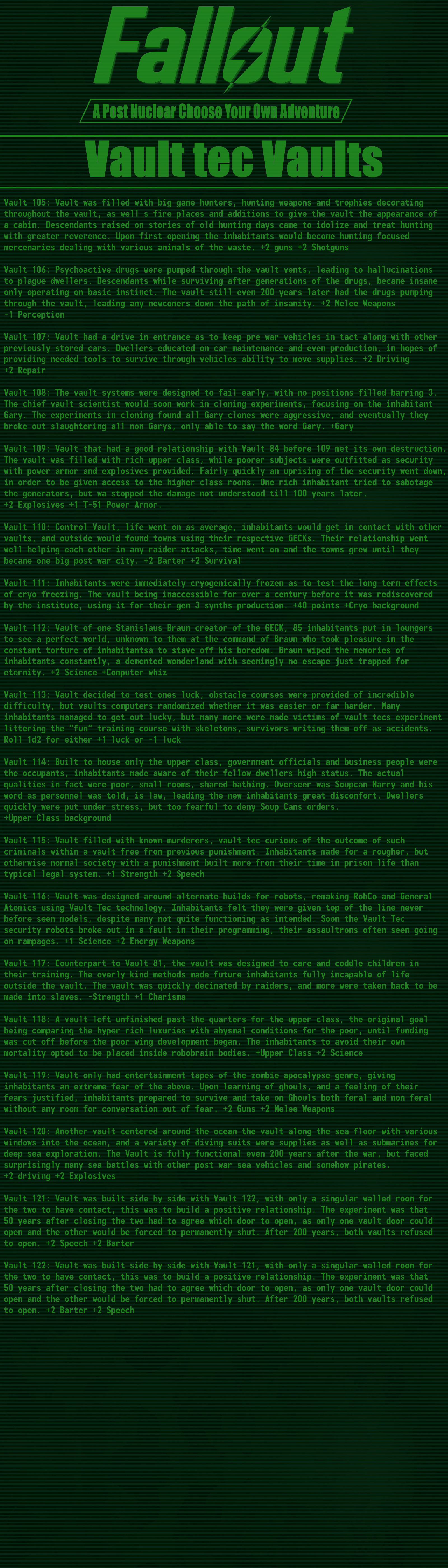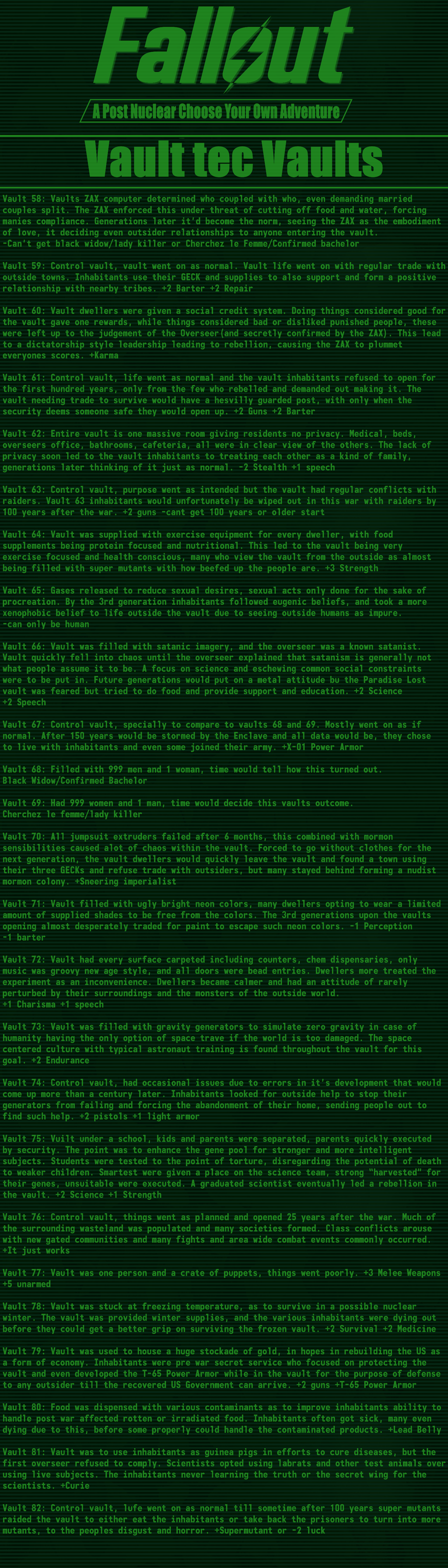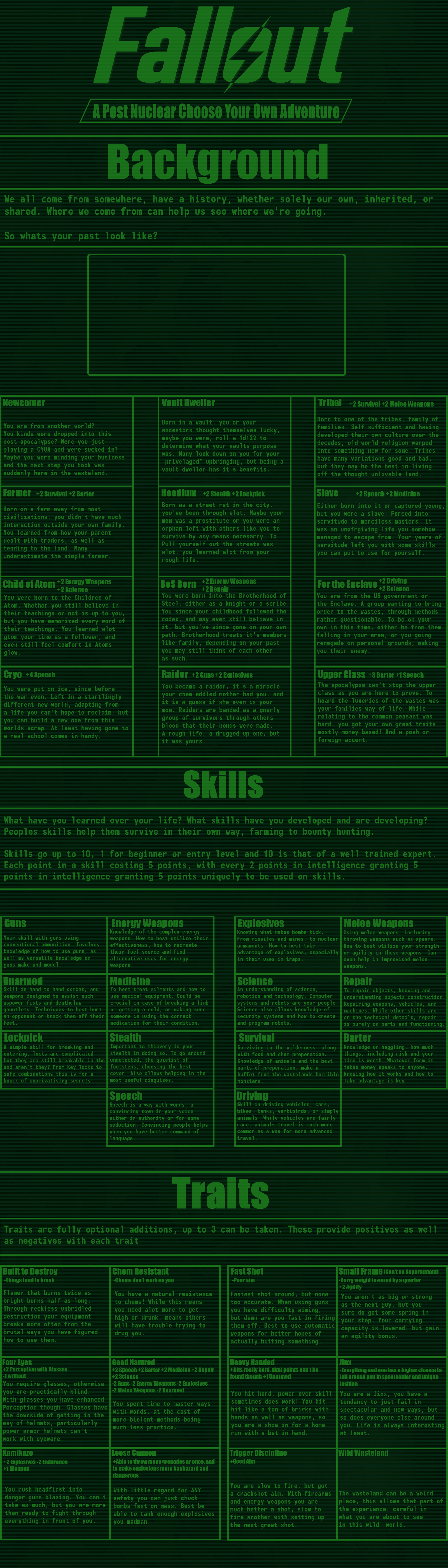 >>97514536good cyoa but it pisses me off so much that the race descriptions mean nothing:>super mutant -> super soldier: "it's kins stunted intelligence not seen in these"ok, so then give me back my intelligence points.>synth -> courser: "coursers are the physical peak and masters of stealth"still has the same stats so it means nothing, you just wasted 15 points for this.