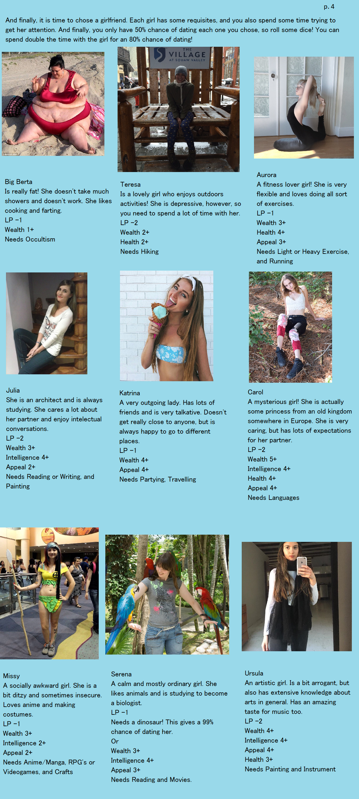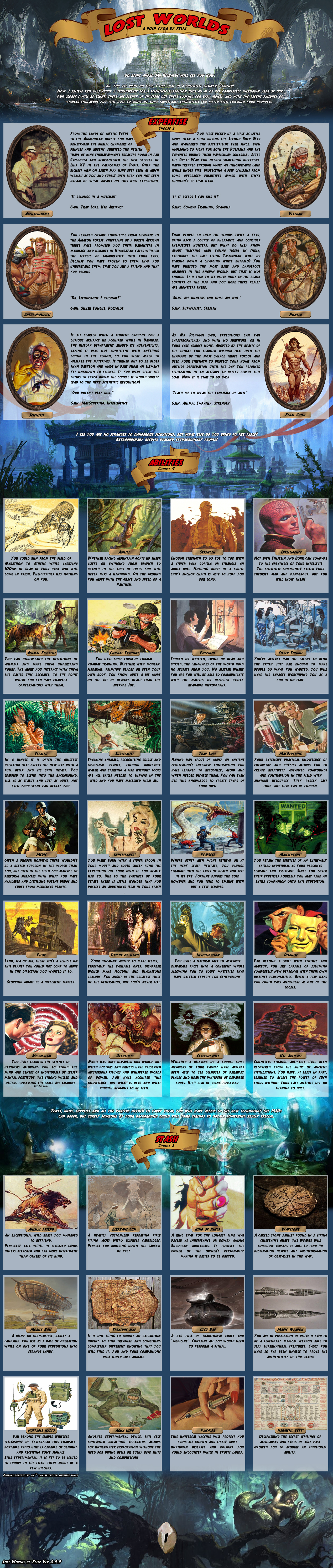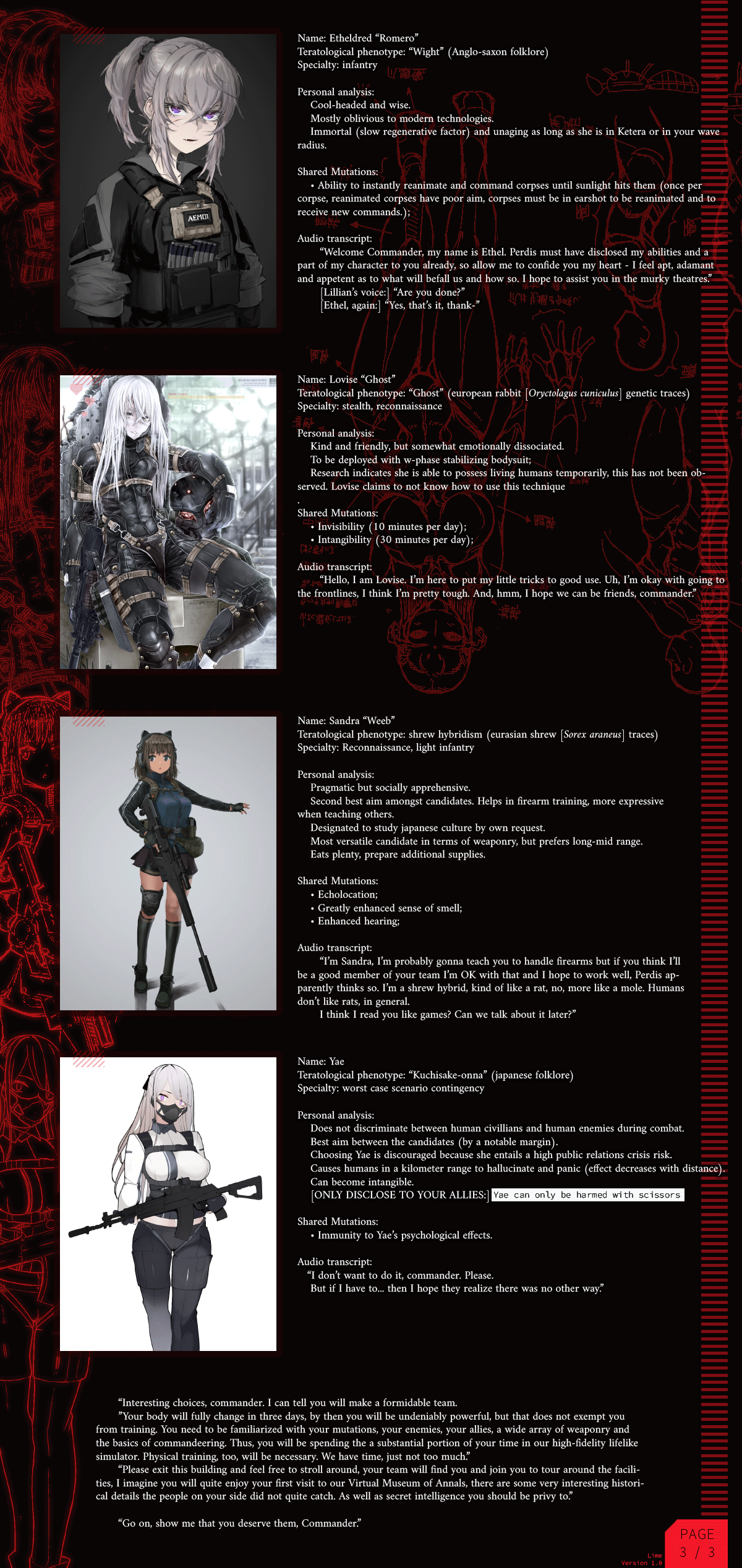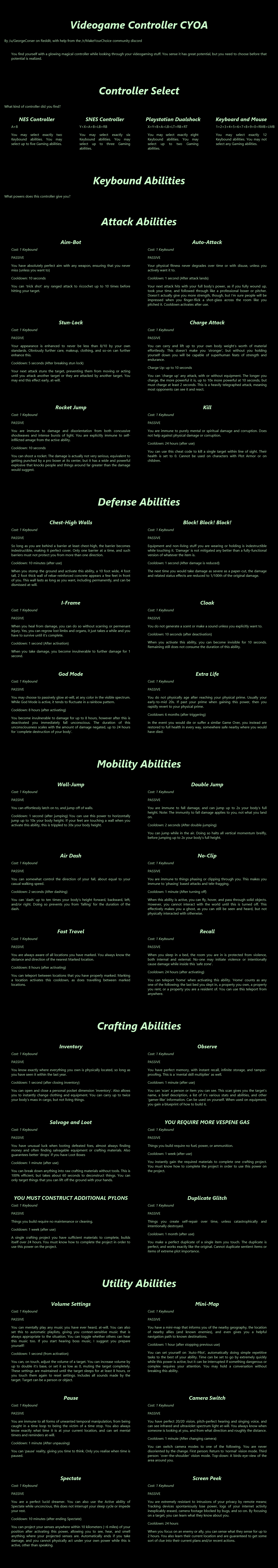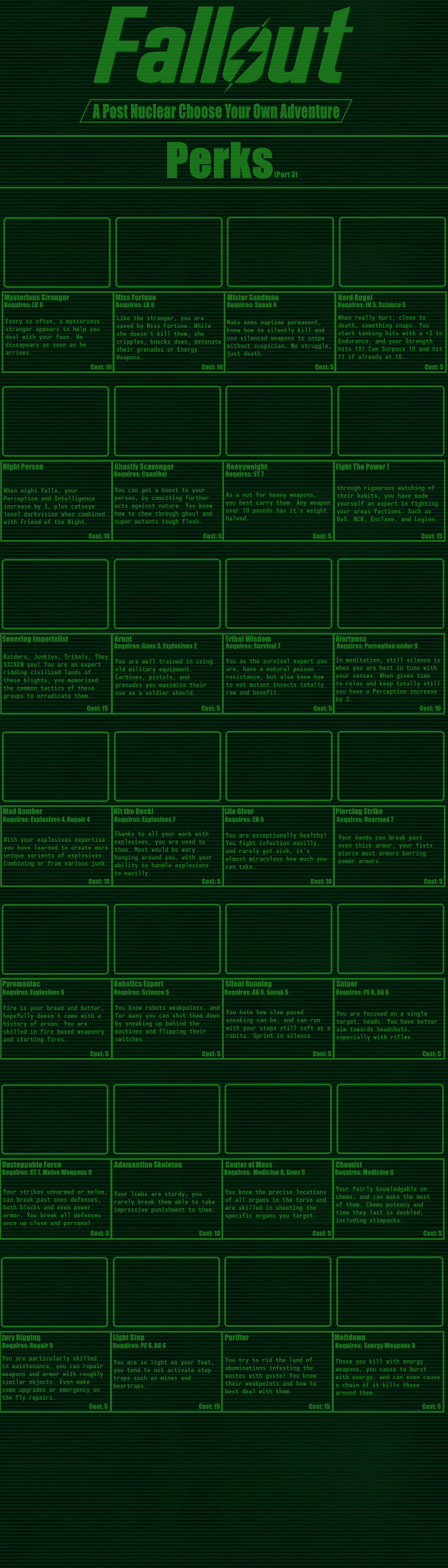 >>97514536good cyoa but it pisses me off so much that the race descriptions mean nothing:>super mutant -> super soldier: "it's kins stunted intelligence not seen in these"ok, so then give me back my intelligence points.>synth -> courser: "coursers are the physical peak and masters of stealth"still has the same stats so it means nothing, you just wasted 15 points for this.