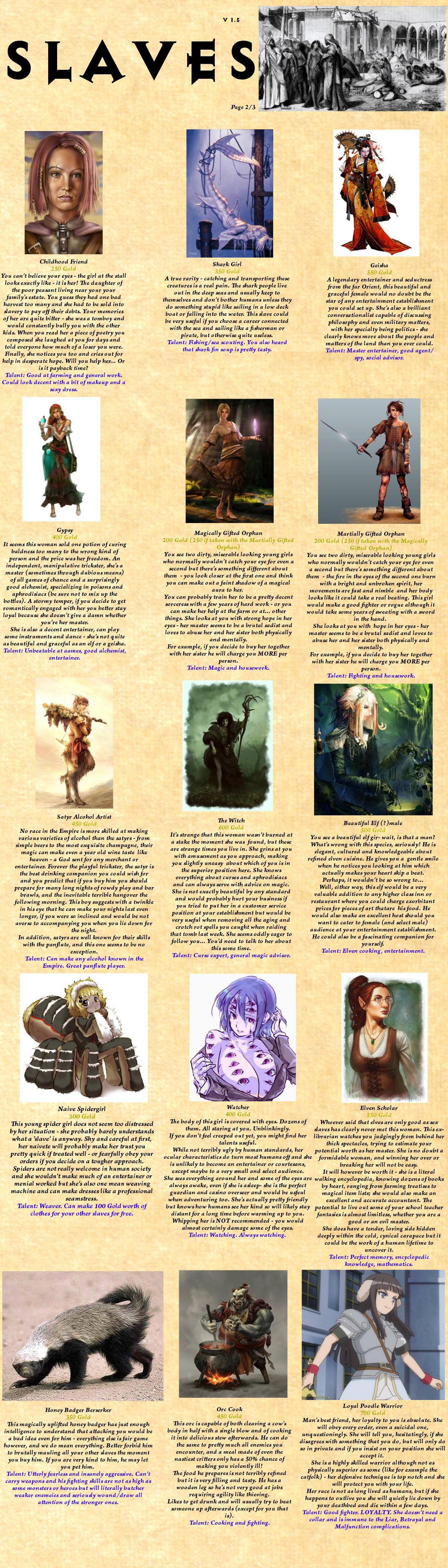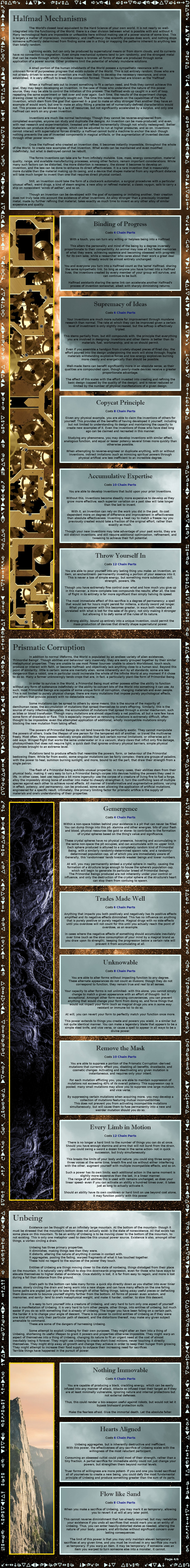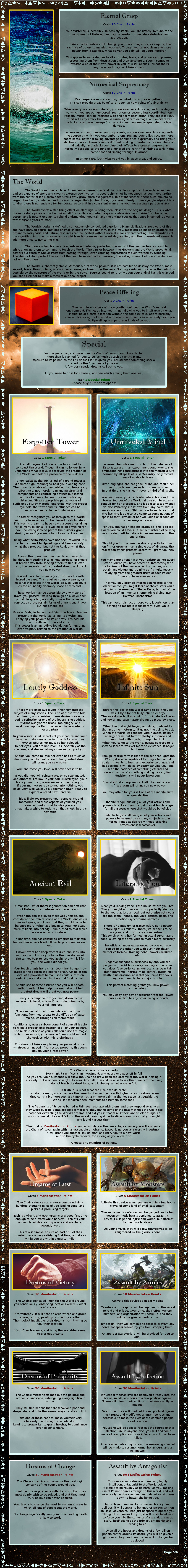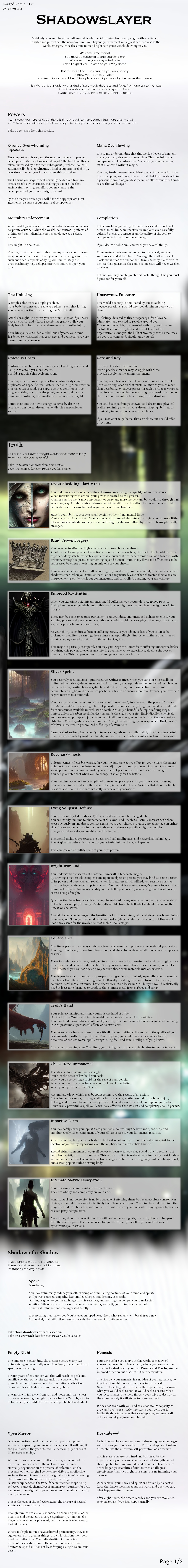>>97519964Adding more words to your CYOA does not make it more interesting or intelligent. Black magic is a fundamentally boring CYOA because its effectively a single choice set with minimal context to interactive with using it. Its interesting as a study of different magical traditions but that same verisimilitude makes it uninteresting as a system and setting.