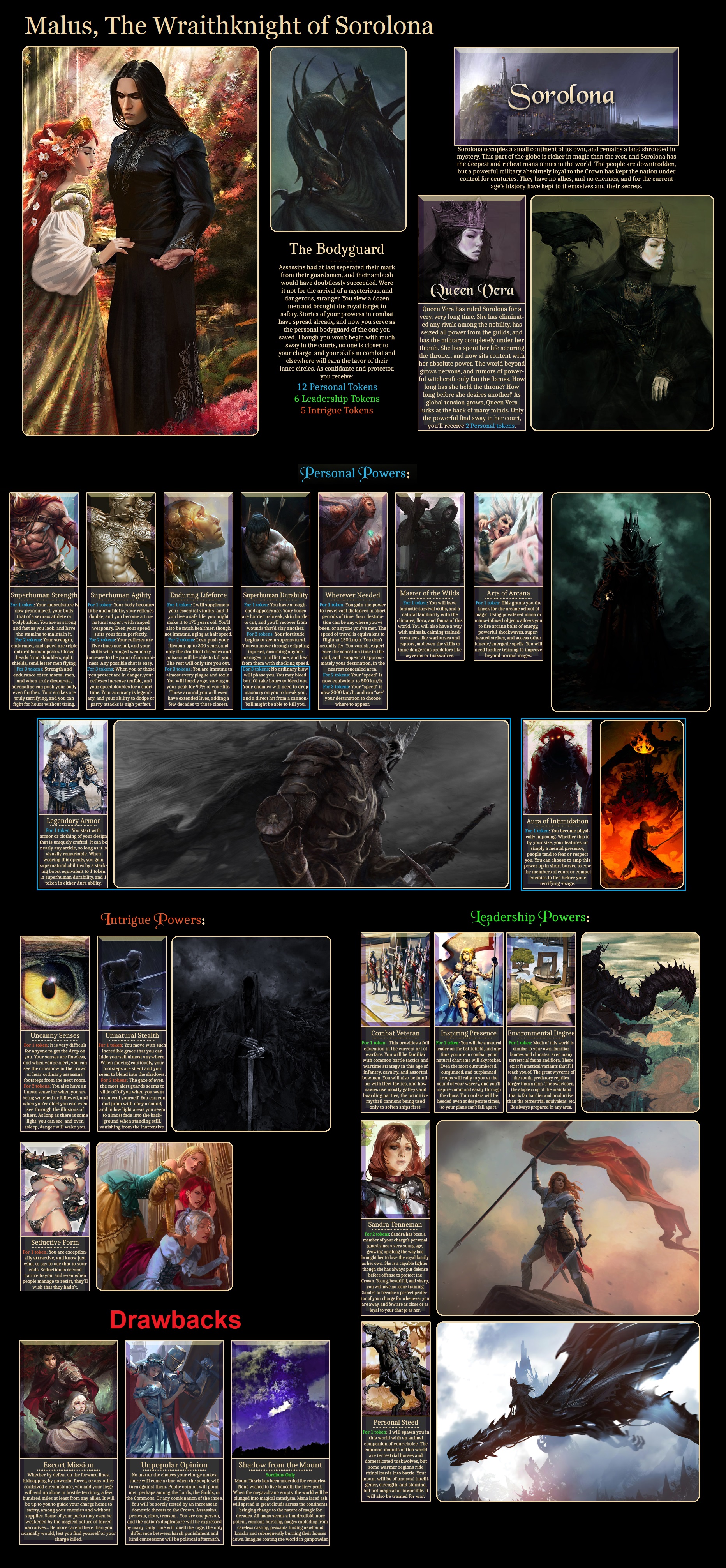 >>97513784Role: Captain of the Guard> 5pt, 20lt, 5itCrown and Wearer: Torvalli & Prince Cael> 4ltPersonal Powers:>Superhuman Durability lvl2>Superhuman Strength lvl2>Aura of IntimidationIntrigue Powers:>Uncanny Senses lvl2>Spy Network lvl1>Foreign Informants lvl1>Unassuming Shape lvl1Leadership Powers:>Historic Education>Religious Education>Engineering Degree>Combat Veteran>Personal Steed>Inspiring Presence>The Tides of WarContacts:>Mikhail Jansen>The Mask of Marks>Jaime Dawncoast>Sandra Tenneman>Eric Keirstrat>Earl Jorn Blackbay>>97513805Based Guar poster>>97513804I'm surprised the Starwars one has done as well as it has considering the big hitters it's contending with.>>97513815You're doing well as is.